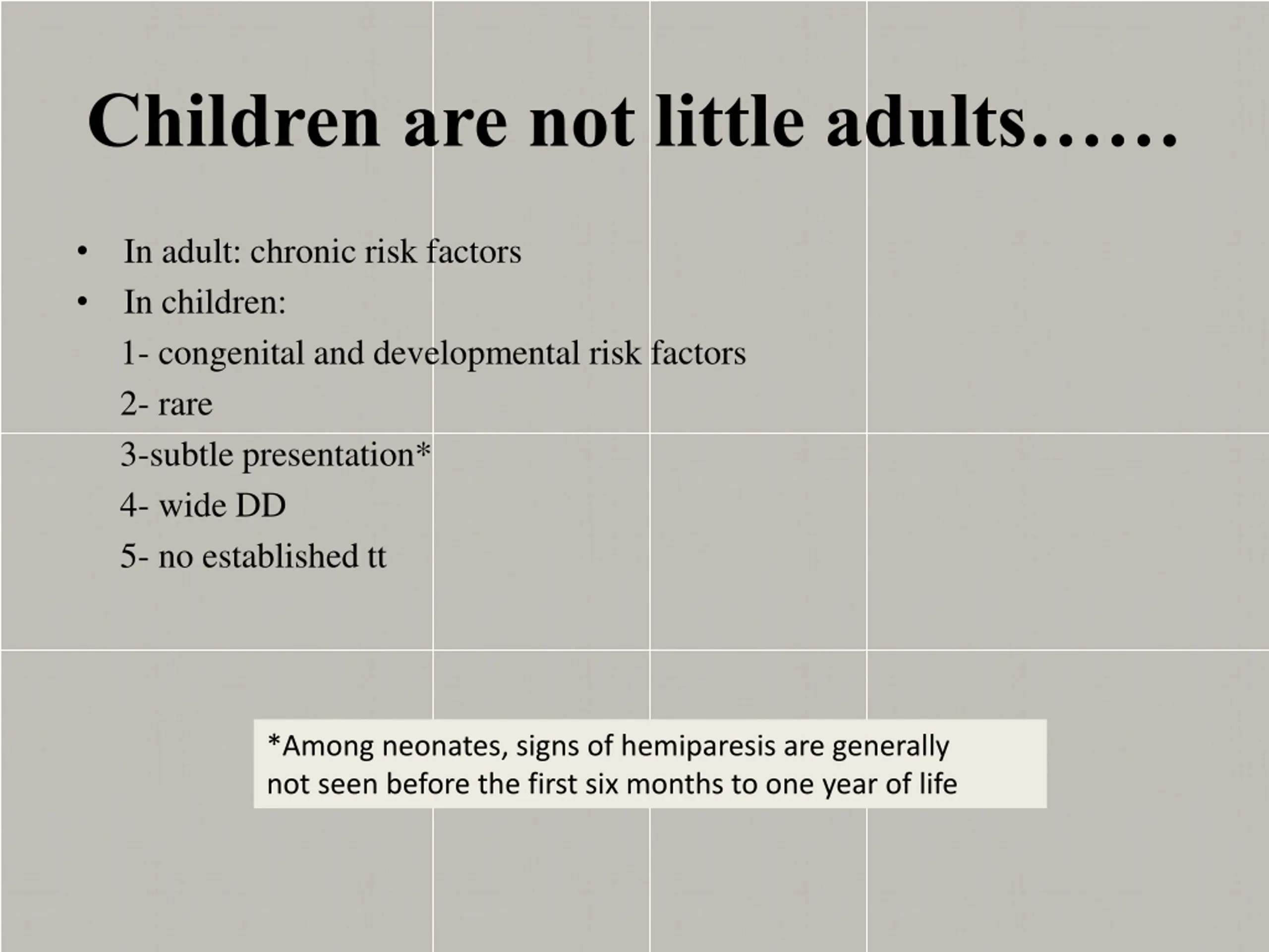 Children are not little adults In adult: chronic risk factors In children: 1- congenital and developmental risk factors 2- rare 3-subtle presentation* 4- wide DD 5- no established tt *Among neonates, signs of hemiparesis are generally not seen before the first six months to one year of life