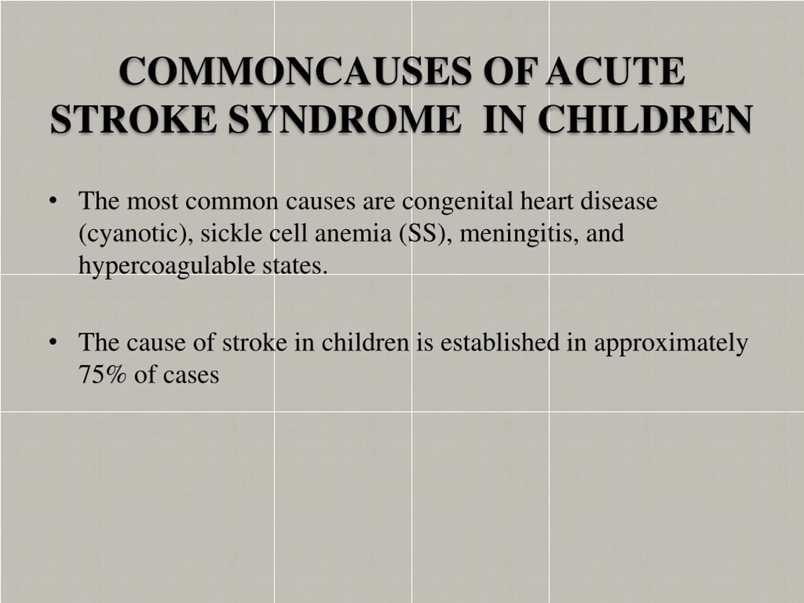 COMMONCAUSES OF ACUTE STROKE SYNDROME IN CHILDREN The most common causes are congenital heart disease (cyanotic), sickle cell anemia (SS), meningitis, and hypercoagulable states. The cause of stroke in children is established in approximately 75% of cases