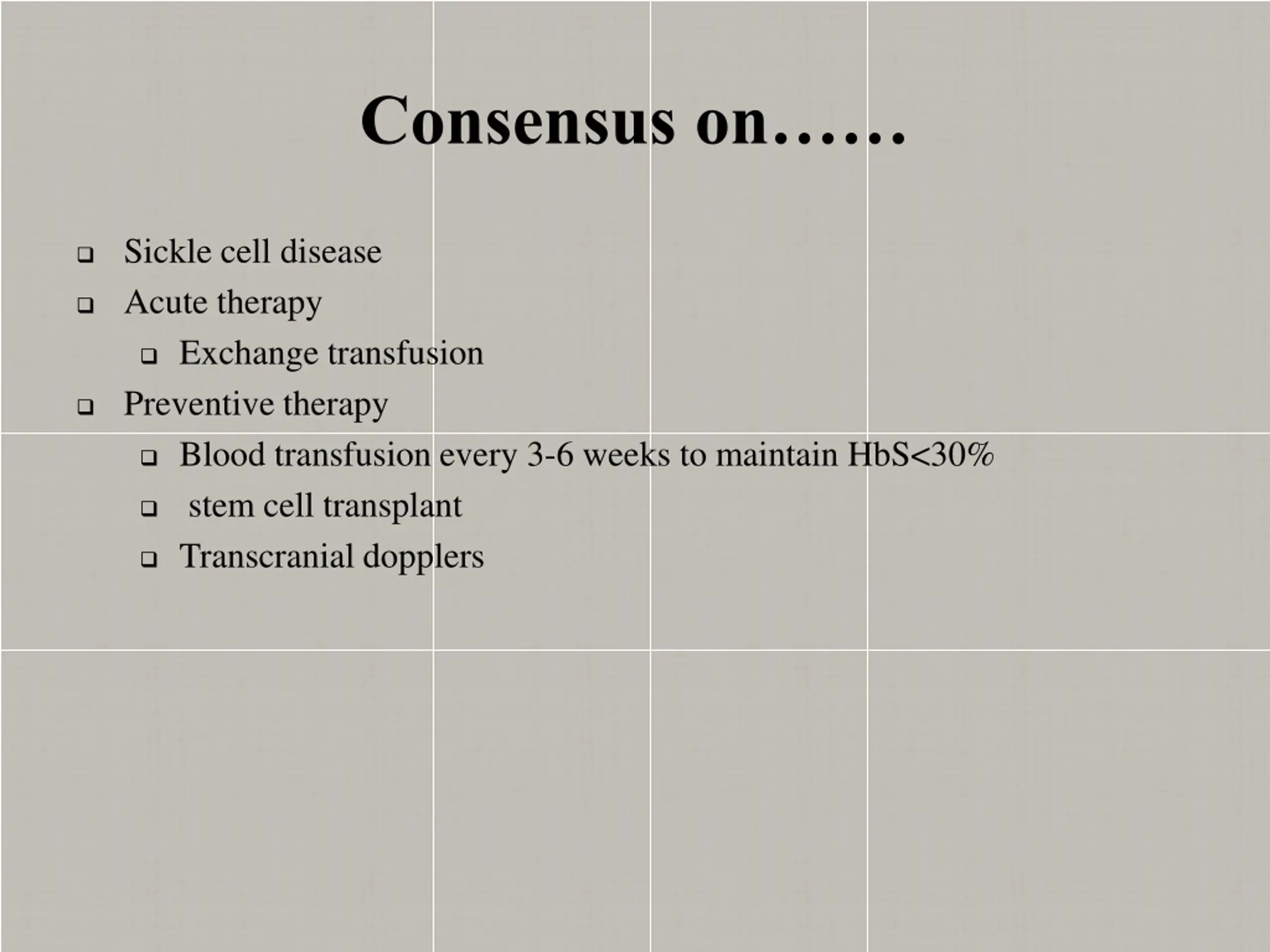 Consensus on Sickle cell disease Acute therapy Exchange transfusion Preventive therapy Blood transfusion every 3-6 weeks to maintain HbS<30% stem cell transplant Transcranial dopplers