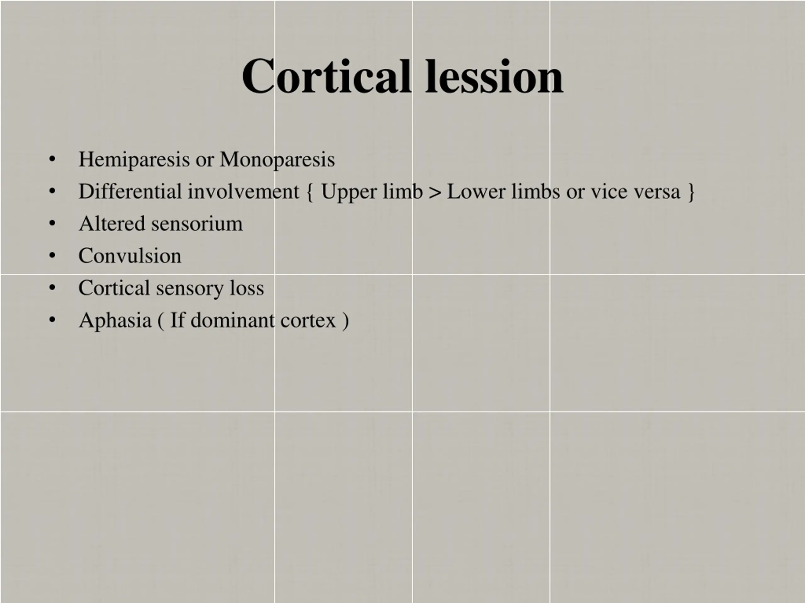 Cortical lession Hemiparesis or Monoparesis Differential involvement { Upper limb > Lower limbs or vice versa } Altered sensorium Convulsion Cortical sensory loss Aphasia ( If dominant cortex )