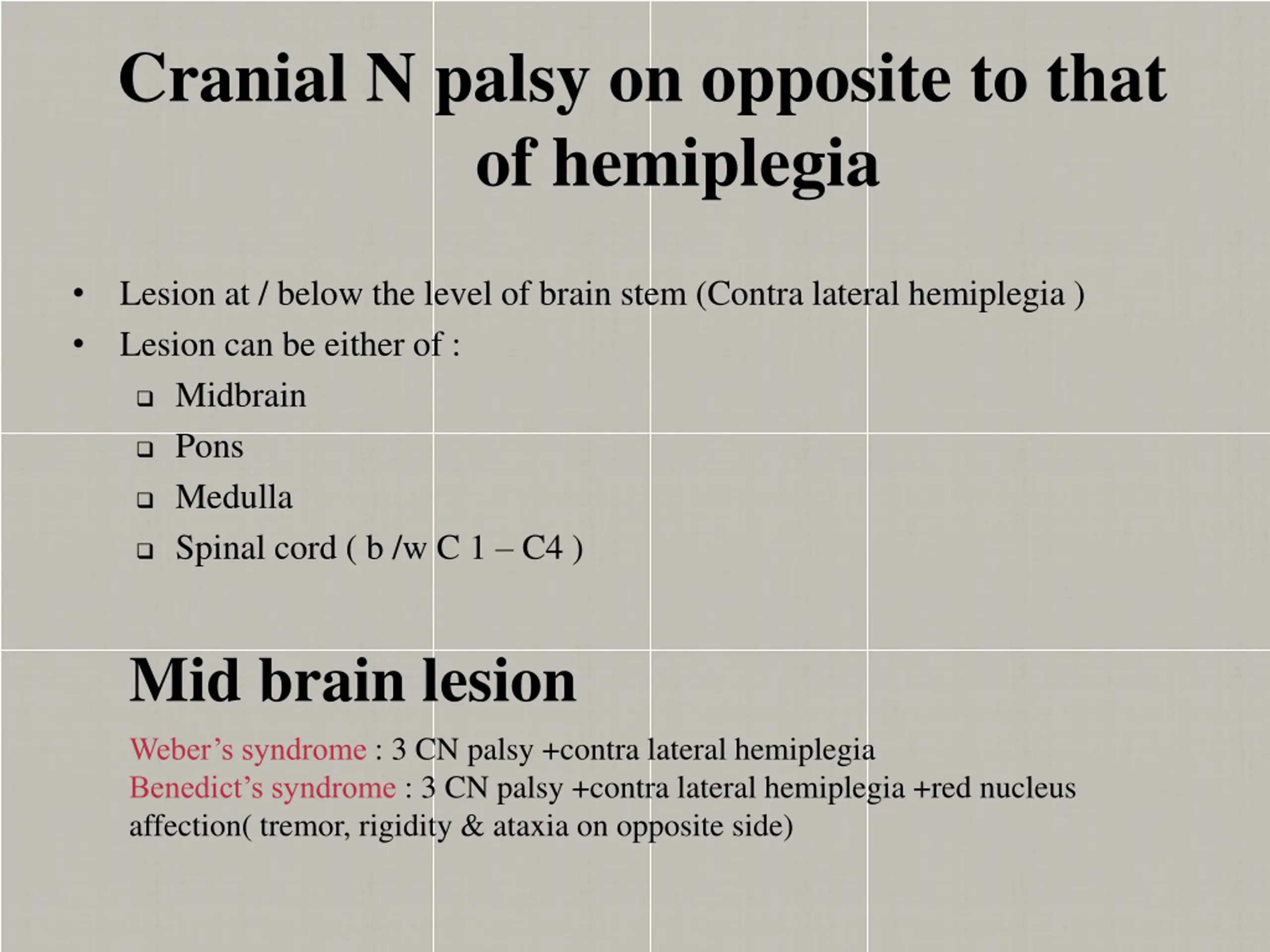 Cranial N palsy on opposite to that of hemiplegia Lesion at / below the level of brain stem (Contra lateral hemiplegia ) Lesion can be either of : Midbrain Pons Medulla Spinal cord ( b /w C 1 C4 ) Mid brain lesion Weber s syndrome : 3 CN palsy +contra lateral hemiplegia Benedict s syndrome : 3 CN palsy +contra lateral hemiplegia +red nucleus affection( tremor, rigidity & ataxia on opposite side)