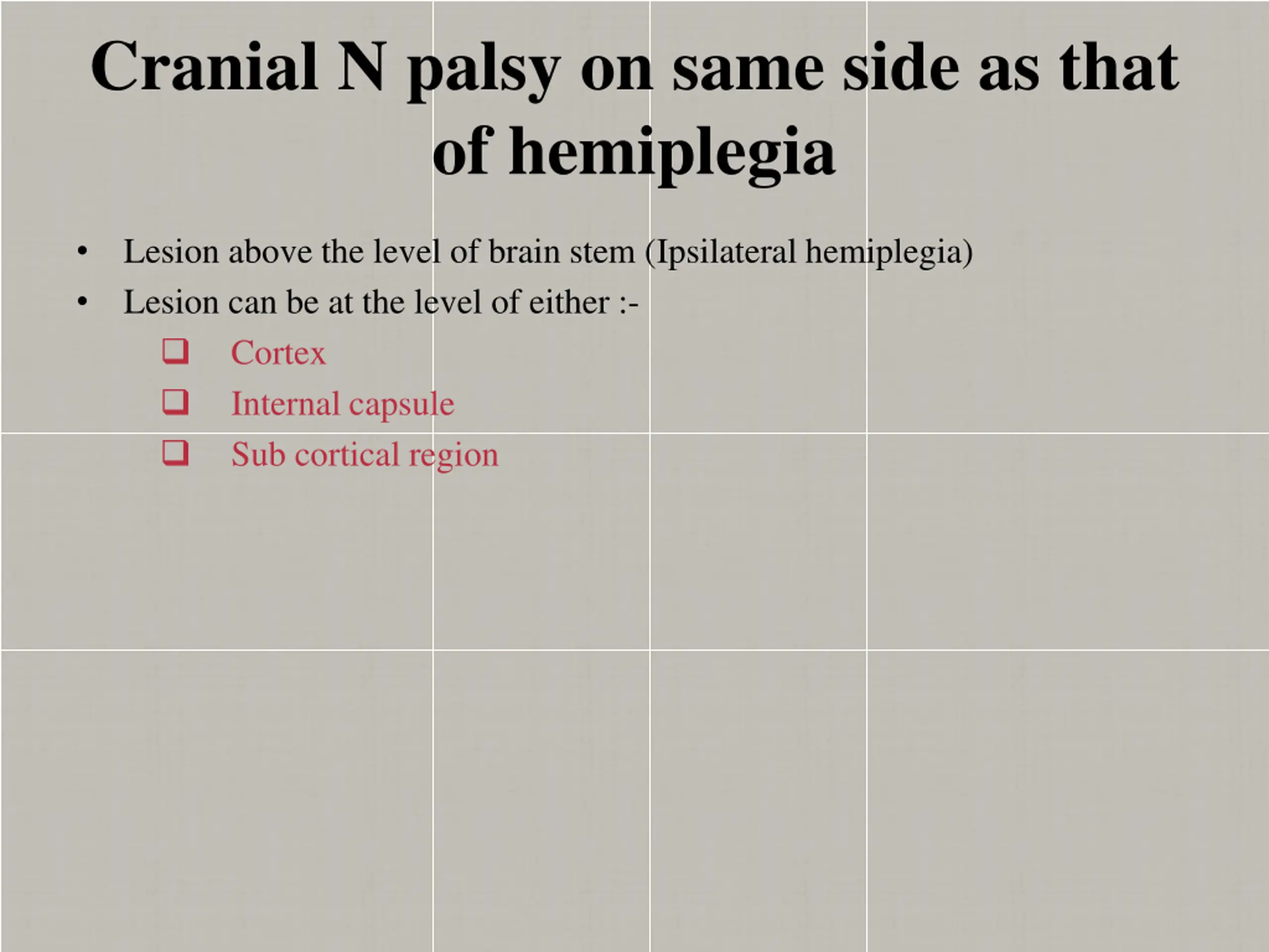 Cranial N palsy on same side as that of hemiplegia Lesion above the level of brain stem (Ipsilateral hemiplegia) Lesion can be at the level of either :- Cortex Internal capsule Sub cortical region