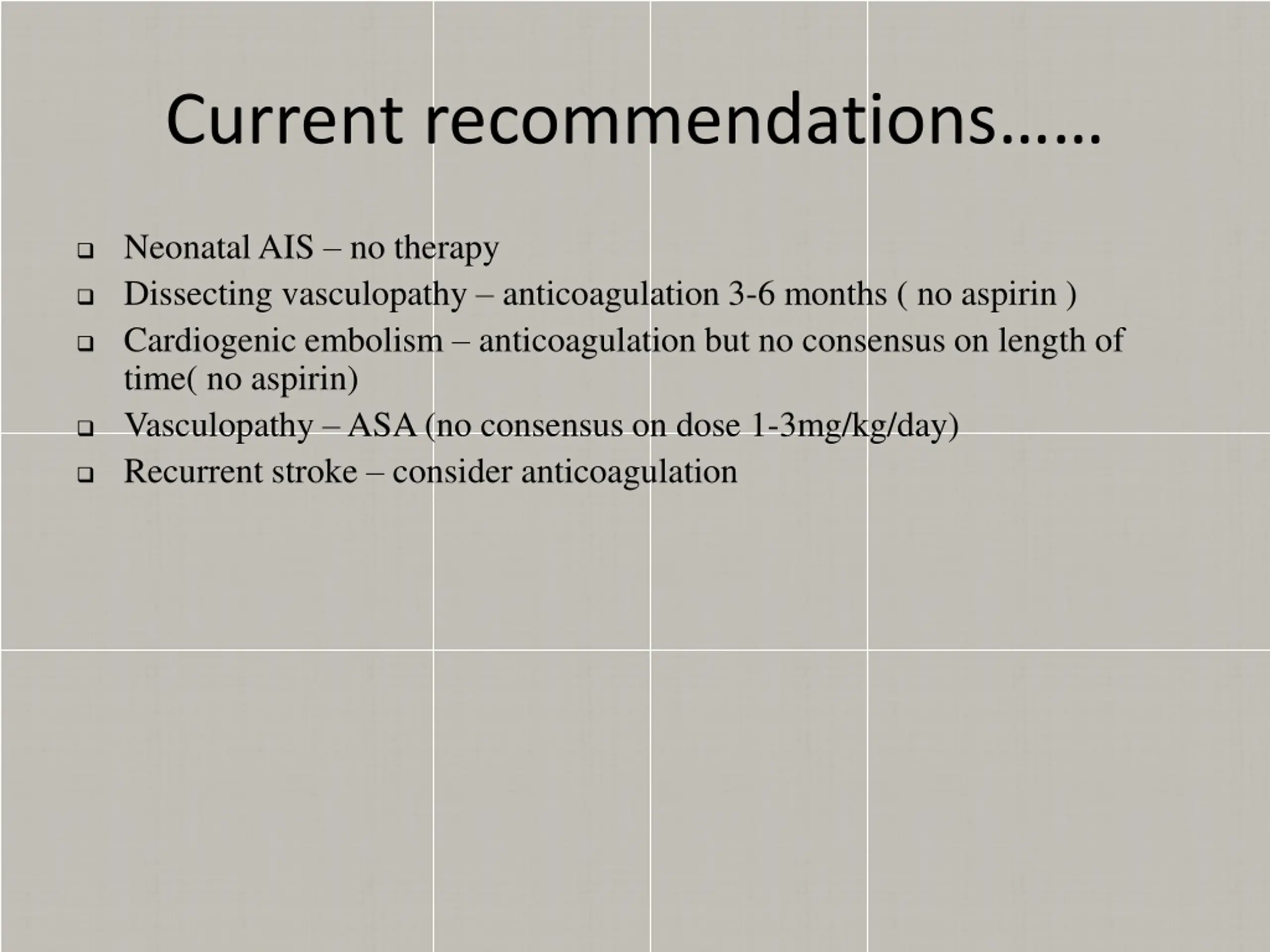Current recommendations Neonatal AIS no therapy Dissecting vasculopathy anticoagulation 3-6 months ( no aspirin ) Cardiogenic embolism anticoagulation but no consensus on length of time( no aspirin) Vasculopathy ASA (no consensus on dose 1-3mg/kg/day) Recurrent stroke consider anticoagulation
