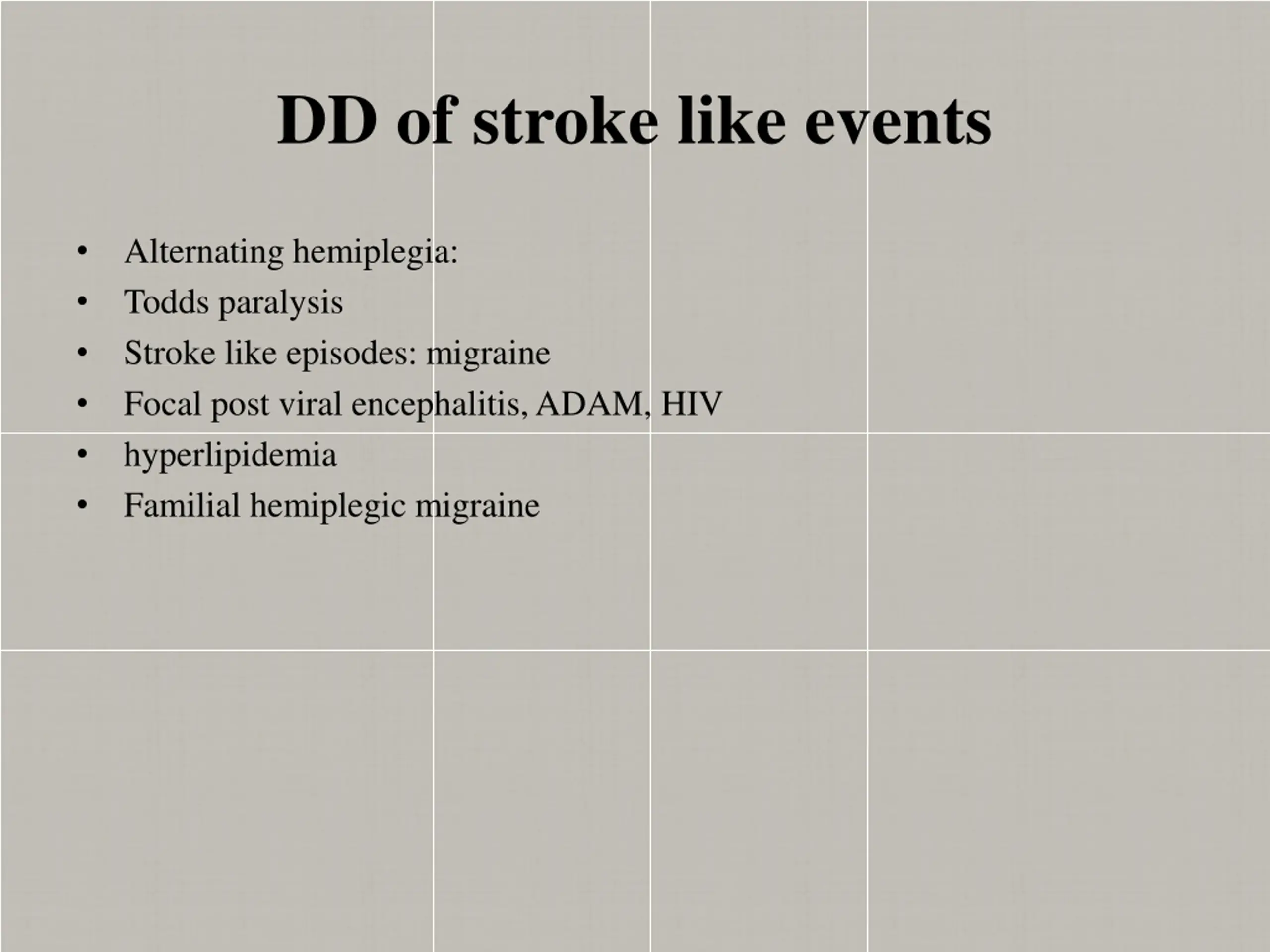 DD of stroke like events Alternating hemiplegia: Todds paralysis Stroke like episodes: migraine Focal post viral encephalitis, ADAM, HIV hyperlipidemia Familial hemiplegic migraine