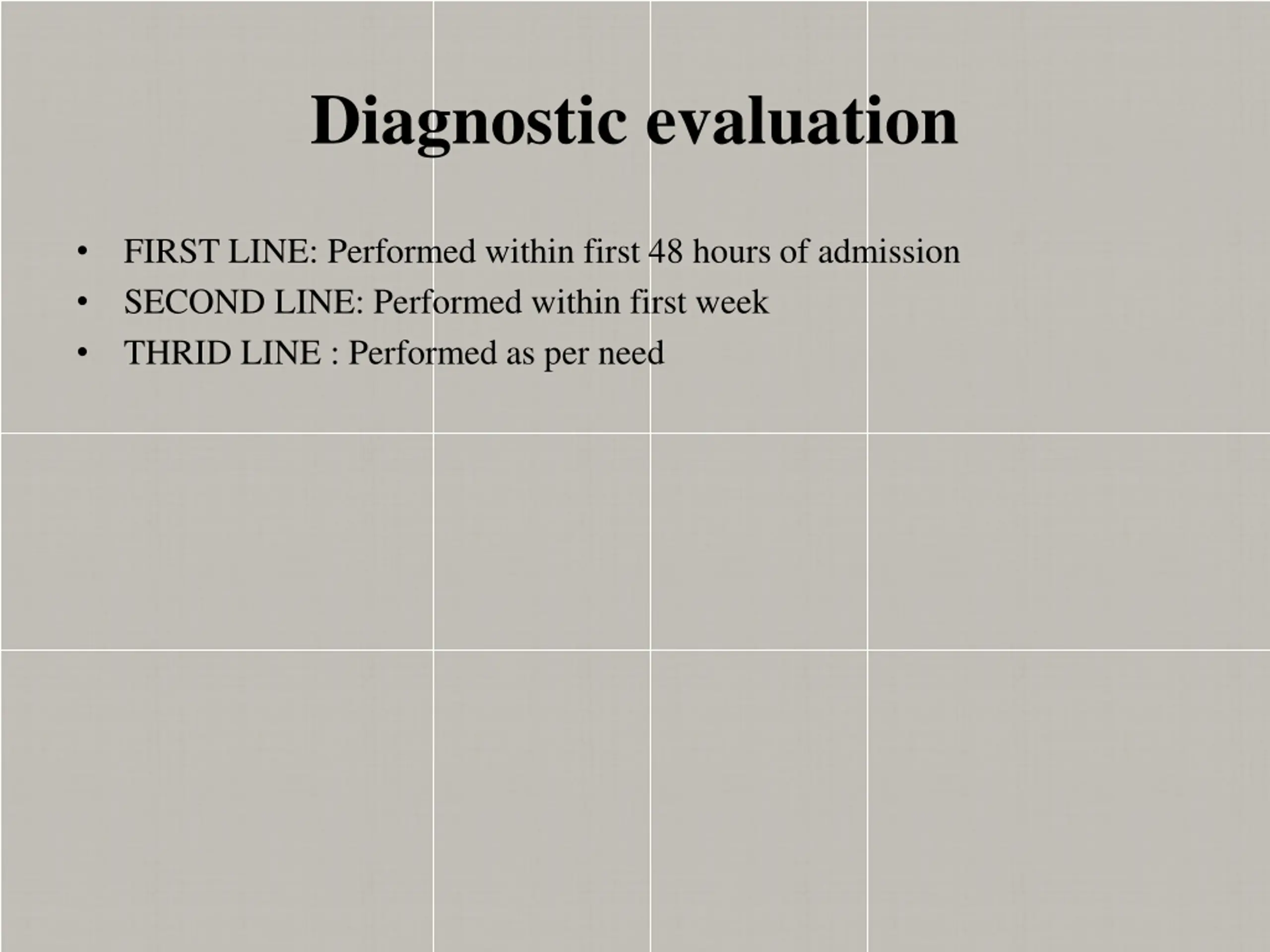 Diagnostic evaluation FIRST LINE: Performed within first 48 hours of admission SECOND LINE: Performed within first week THRID LINE : Performed as per need