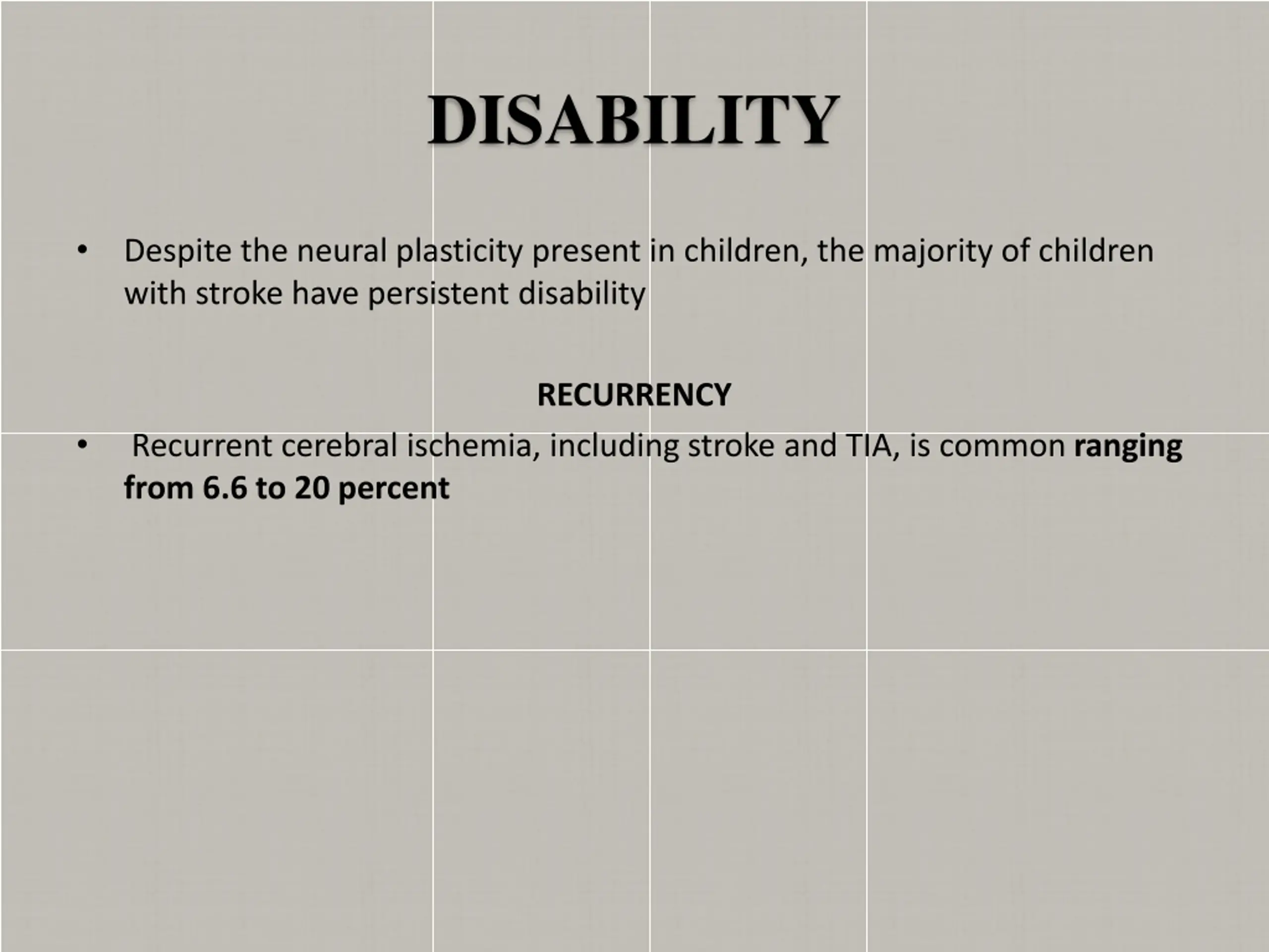 DISABILITY Despite the neural plasticity present in children, the majority of children with stroke have persistent disability RECURRENCY Recurrent cerebral ischemia, including stroke and TIA, is common ranging from 6.6 to 20 percent