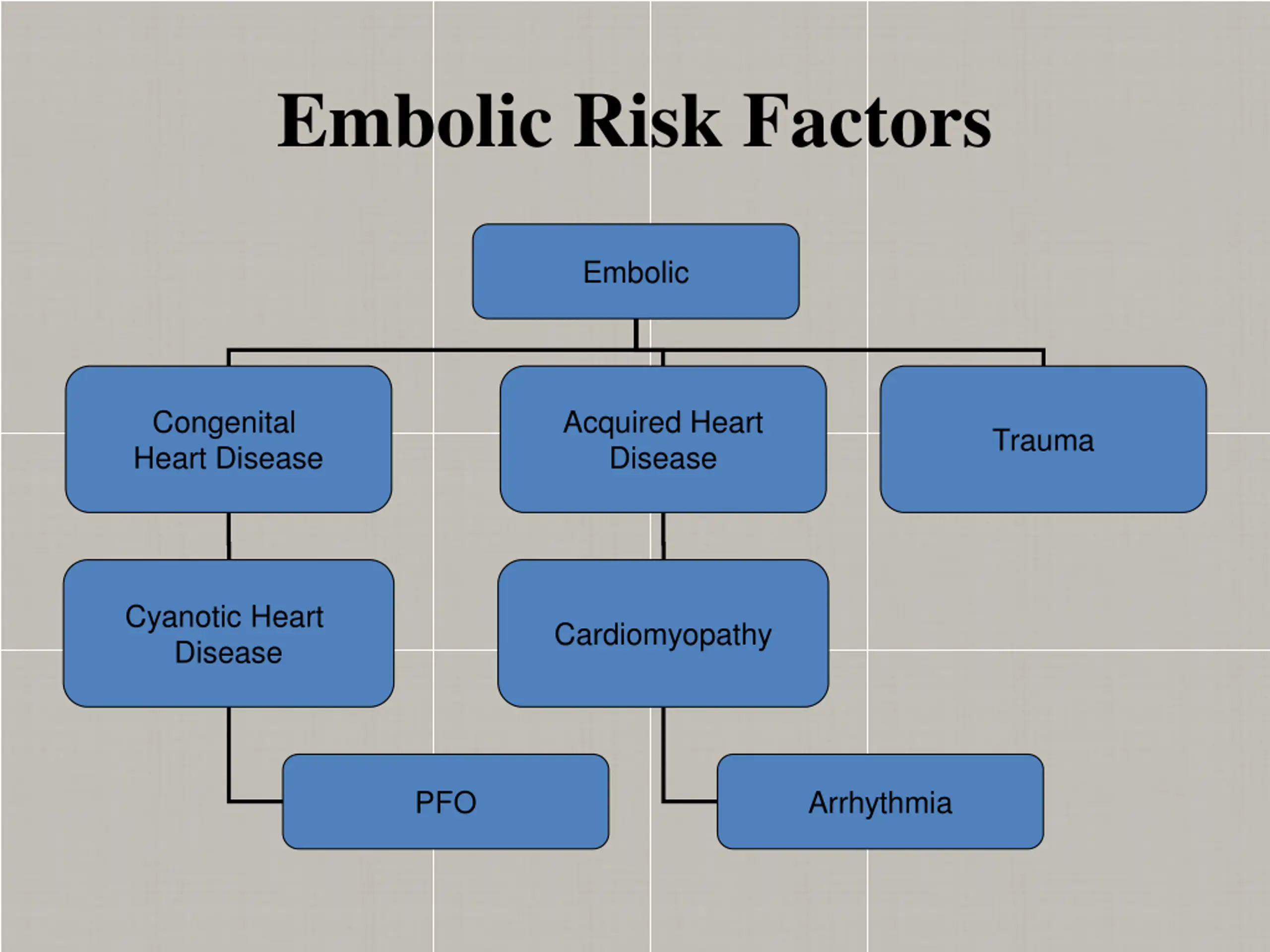 Embolic Risk Factors Embolic Congenital Heart Disease Acquired Heart Disease Trauma Cyanotic Heart Disease Cardiomyopathy PFO Arrhythmia