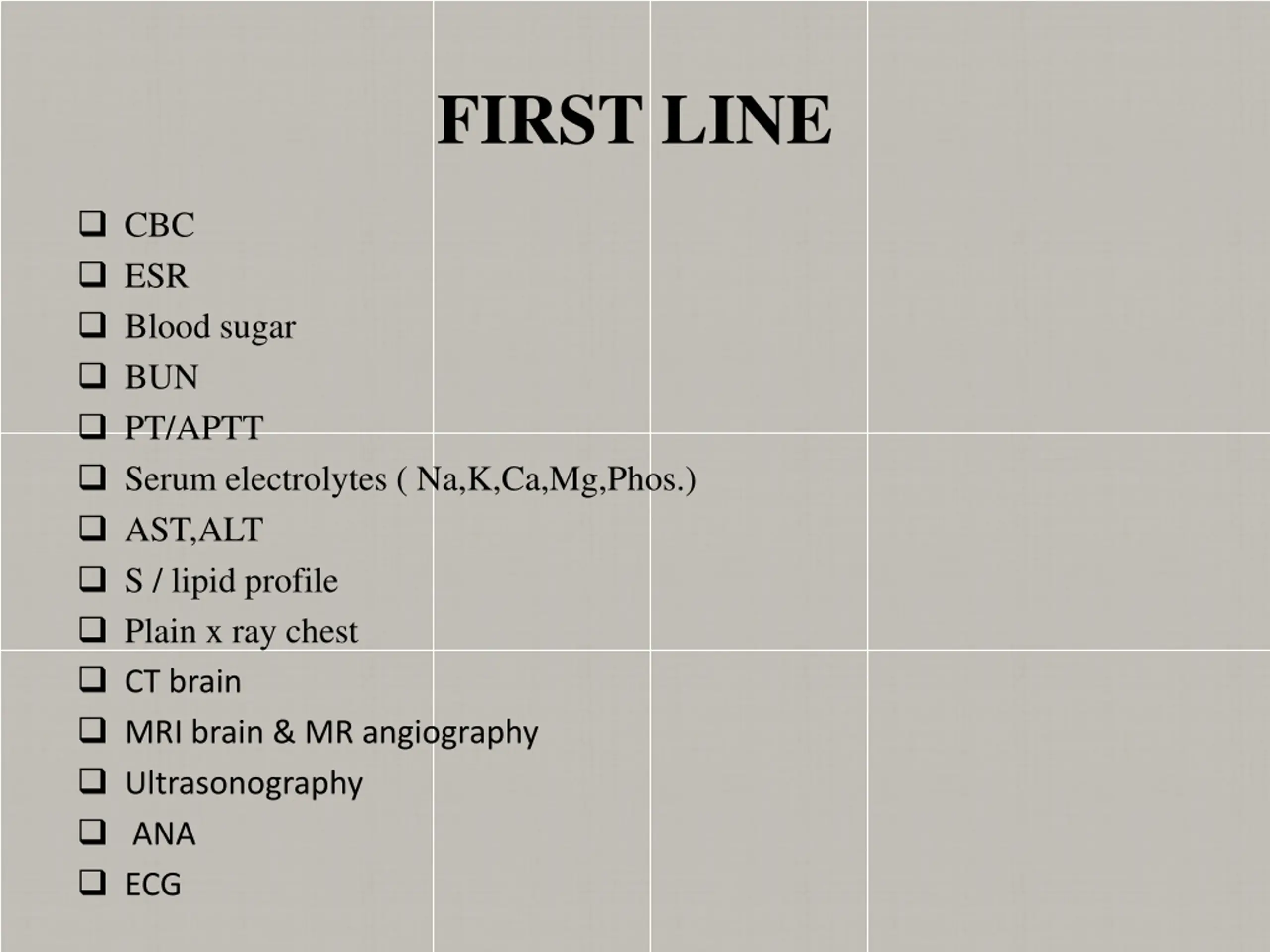 FIRST LINE CBC ESR Blood sugar BUN PT/APTT Serum electrolytes ( Na,K,Ca,Mg,Phos.) AST,ALT S / lipid profile Plain x ray chest CT brain MRI brain & MR angiography Ultrasonography ANA ECG