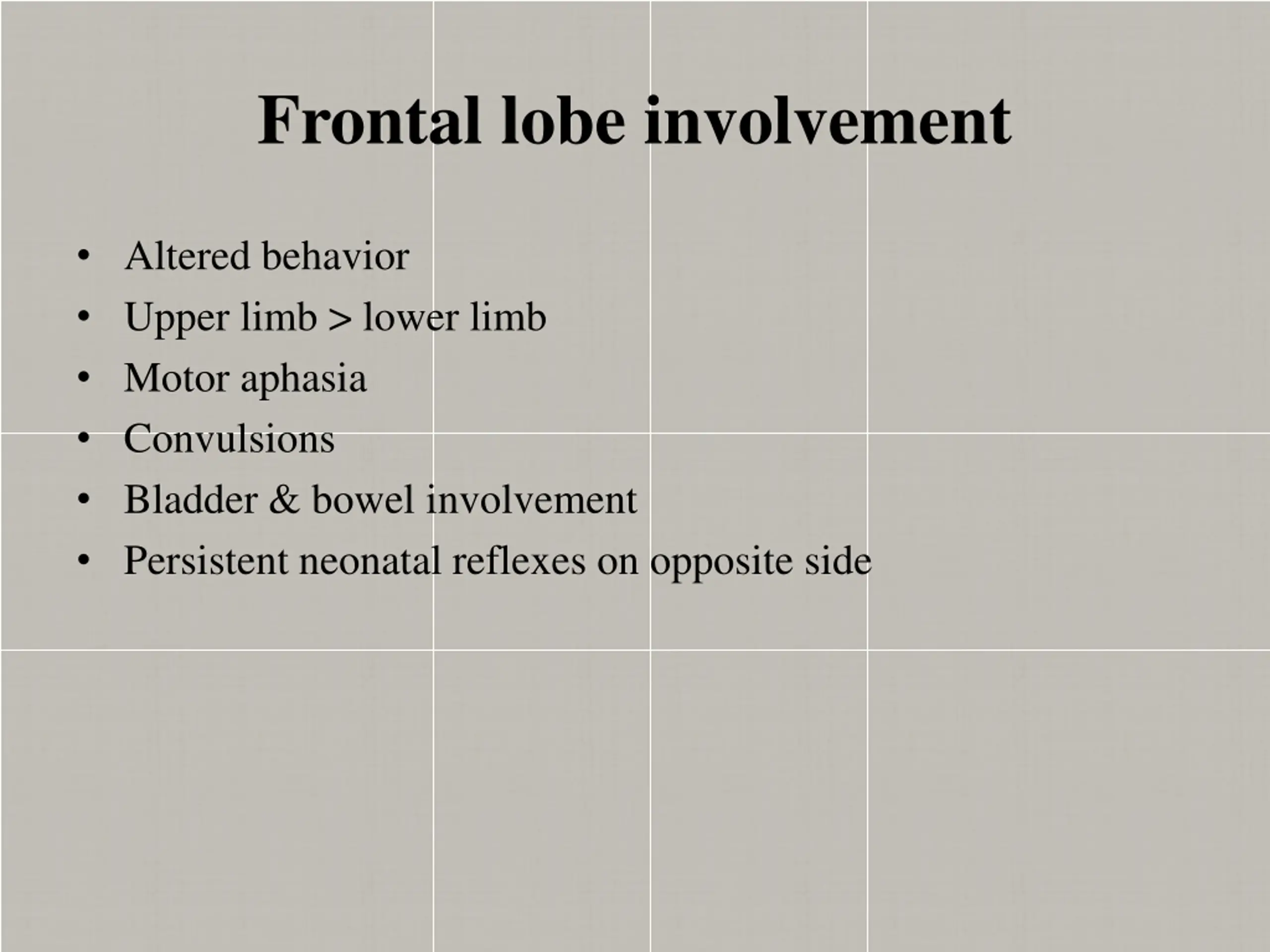 Frontal lobe involvement Altered behavior Upper limb > lower limb Motor aphasia Convulsions Bladder & bowel involvement Persistent neonatal reflexes on opposite side