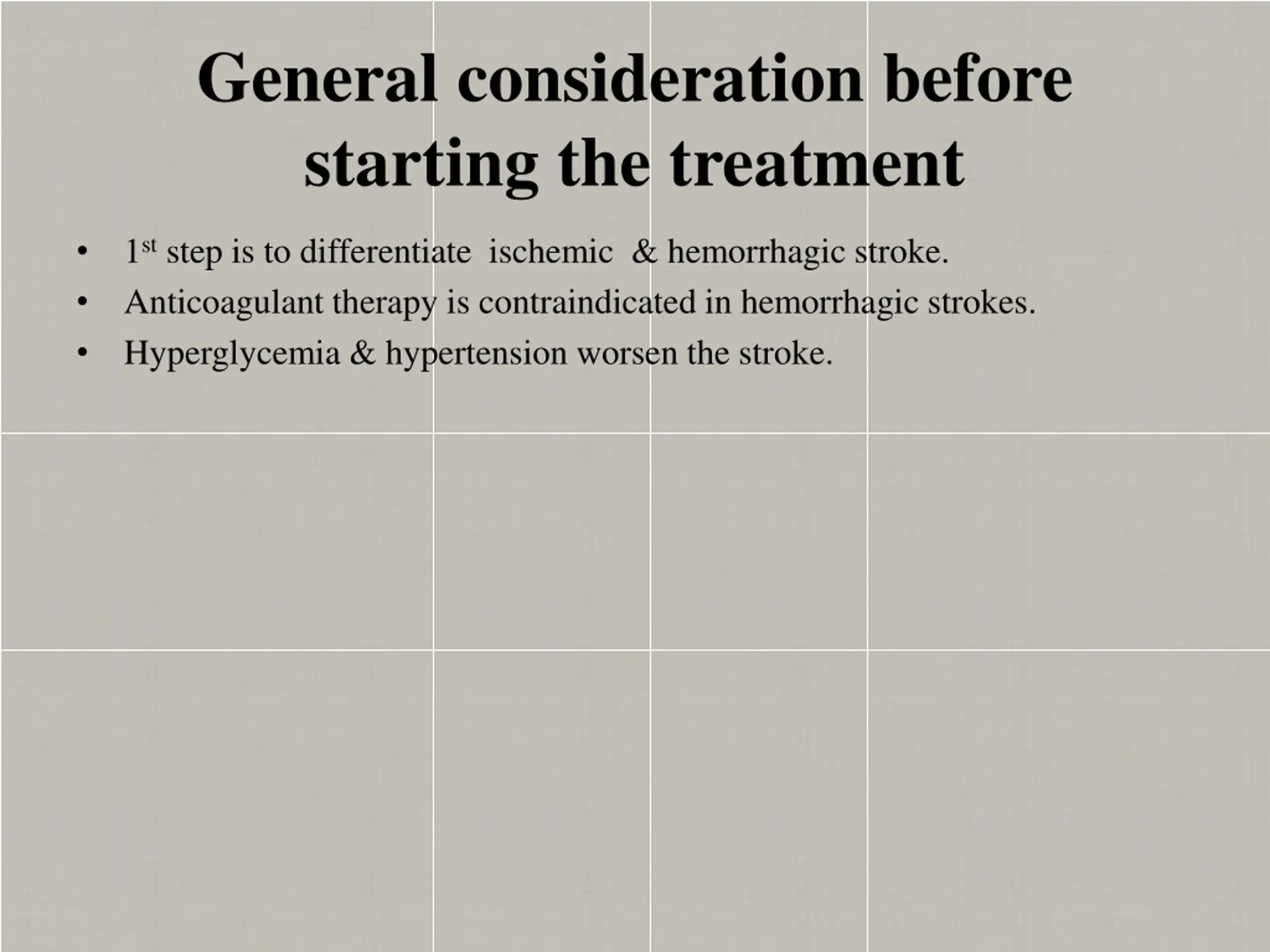 General consideration before starting the treatment 1st step is to differentiate ischemic & hemorrhagic stroke. Anticoagulant therapy is contraindicated in hemorrhagic strokes. Hyperglycemia & hypertension worsen the stroke.