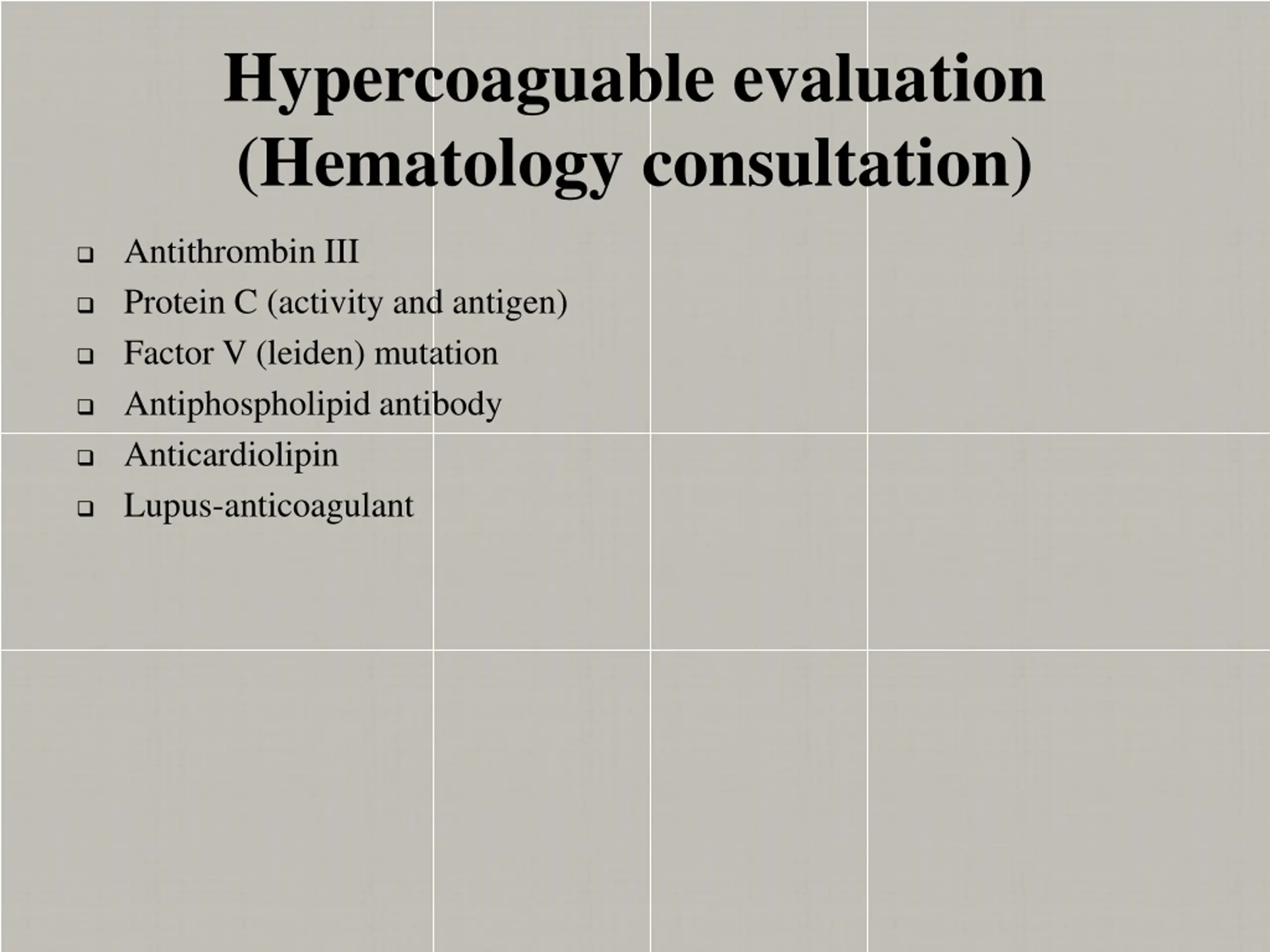 Hypercoaguable evaluation (Hematology consultation) Antithrombin III Protein C (activity and antigen) Factor V (leiden) mutation Antiphospholipid antibody Anticardiolipin Lupus-anticoagulant