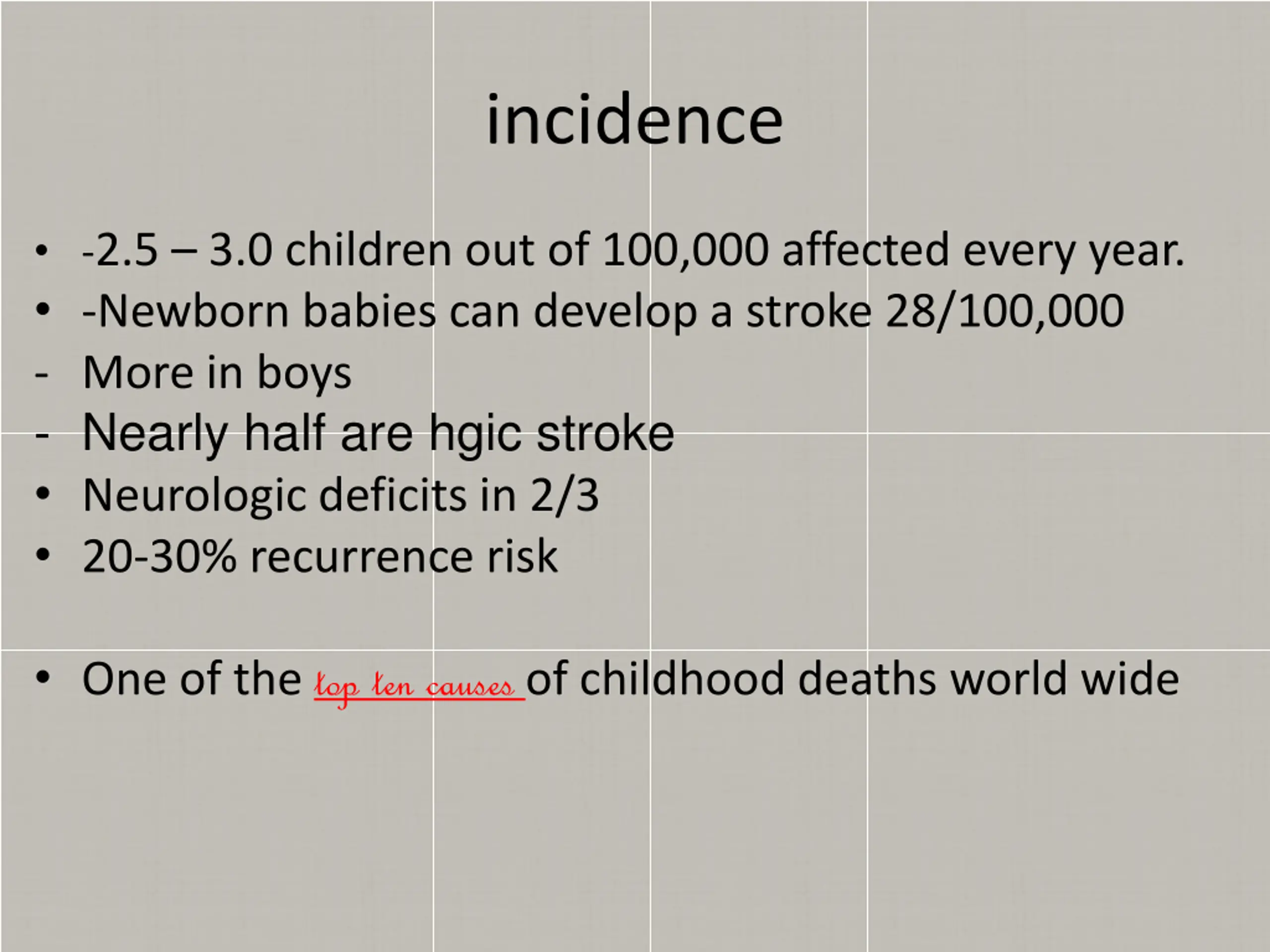 incidence -2.5 3.0 children out of 100,000 affected every year. -Newborn babies can develop a stroke 28/100,000 - More in boys - Nearly half are hgic stroke Neurologic deficits in 2/3 20-30% recurrence risk One of the top ten causes of childhood deaths world wide