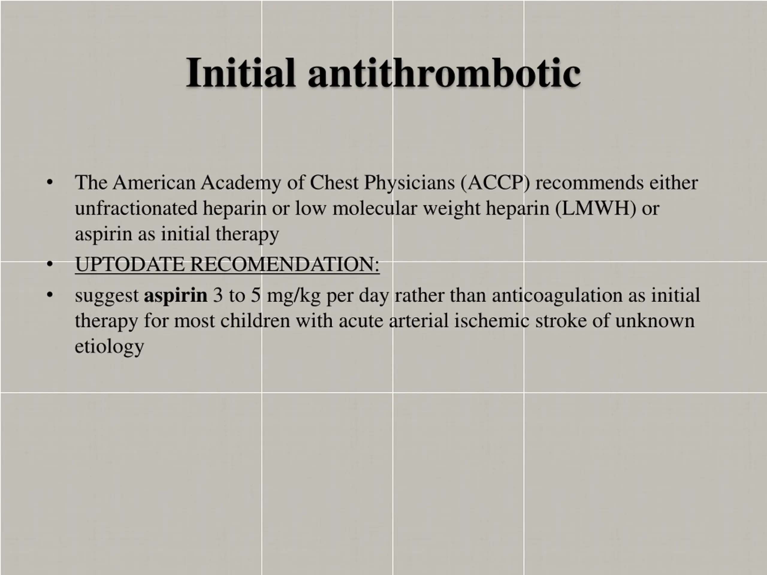 Initial antithrombotic The American Academy of Chest Physicians (ACCP) recommends either unfractionated heparin or low molecular weight heparin (LMWH) or aspirin as initial therapy UPTODATE RECOMENDATION: suggest aspirin 3 to 5 mg/kg per day rather than anticoagulation as initial therapy for most children with acute arterial ischemic stroke of unknown etiology