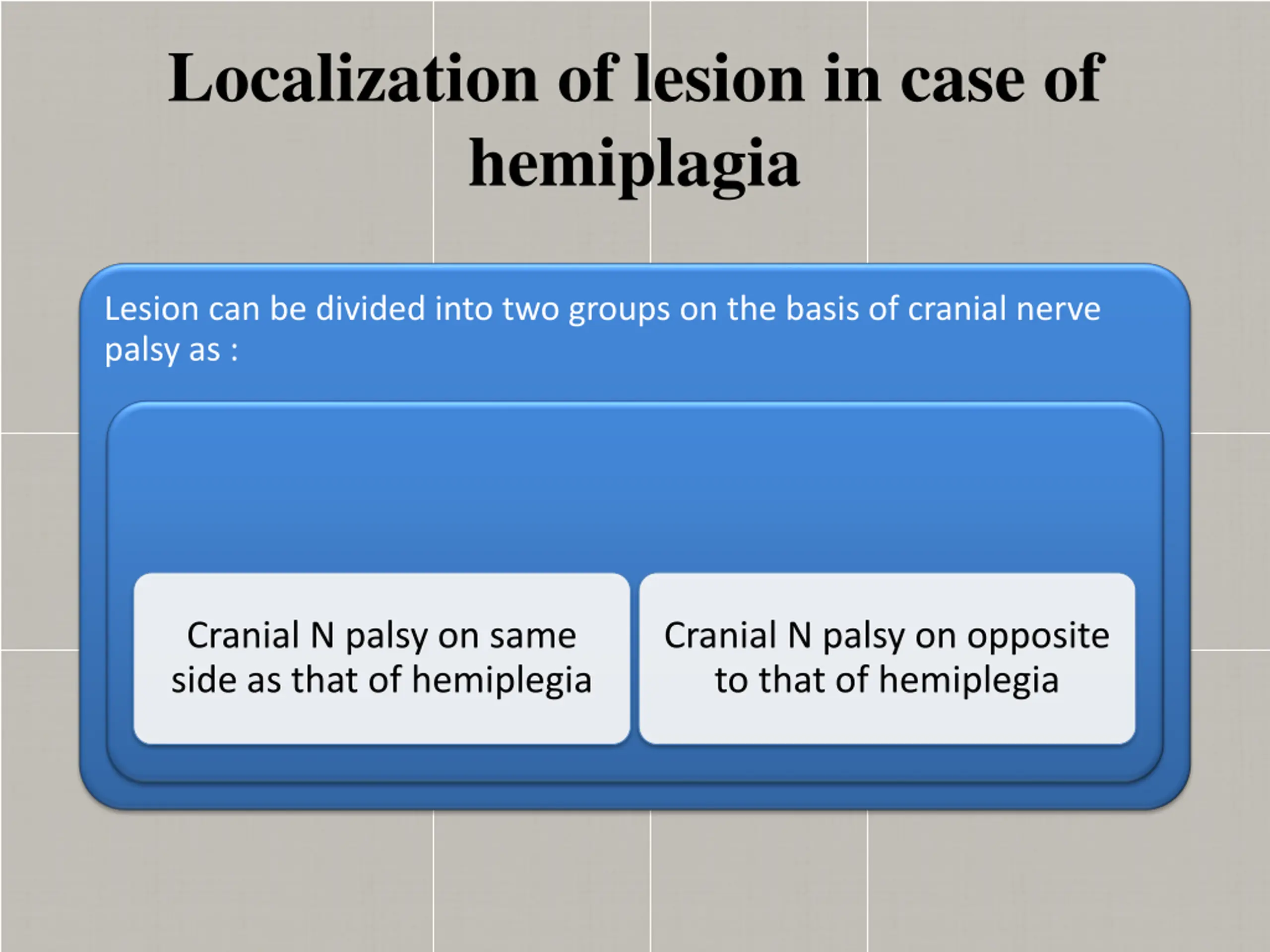 Localization of lesion in case of hemiplagia Lesion can be divided into two groups on the basis of cranial nerve palsy as : Cranial N palsy on same side as that of hemiplegia Cranial N palsy on opposite to that of hemiplegia
