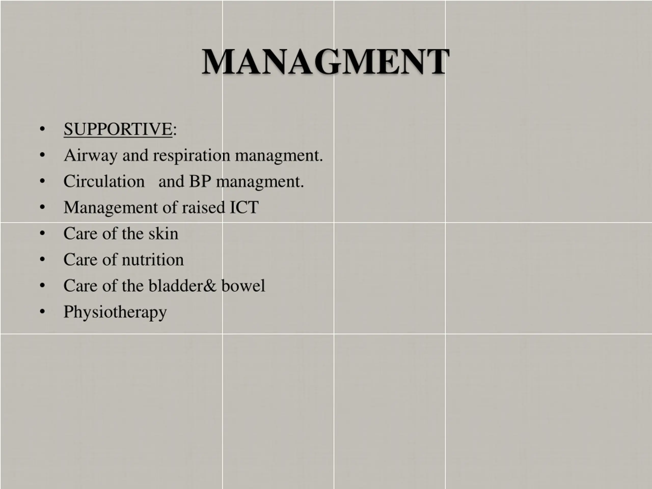 MANAGMENT SUPPORTIVE: Airway and respiration managment. Circulation and BP managment. Management of raised ICT Care of the skin Care of nutrition Care of the bladder& bowel Physiotherapy