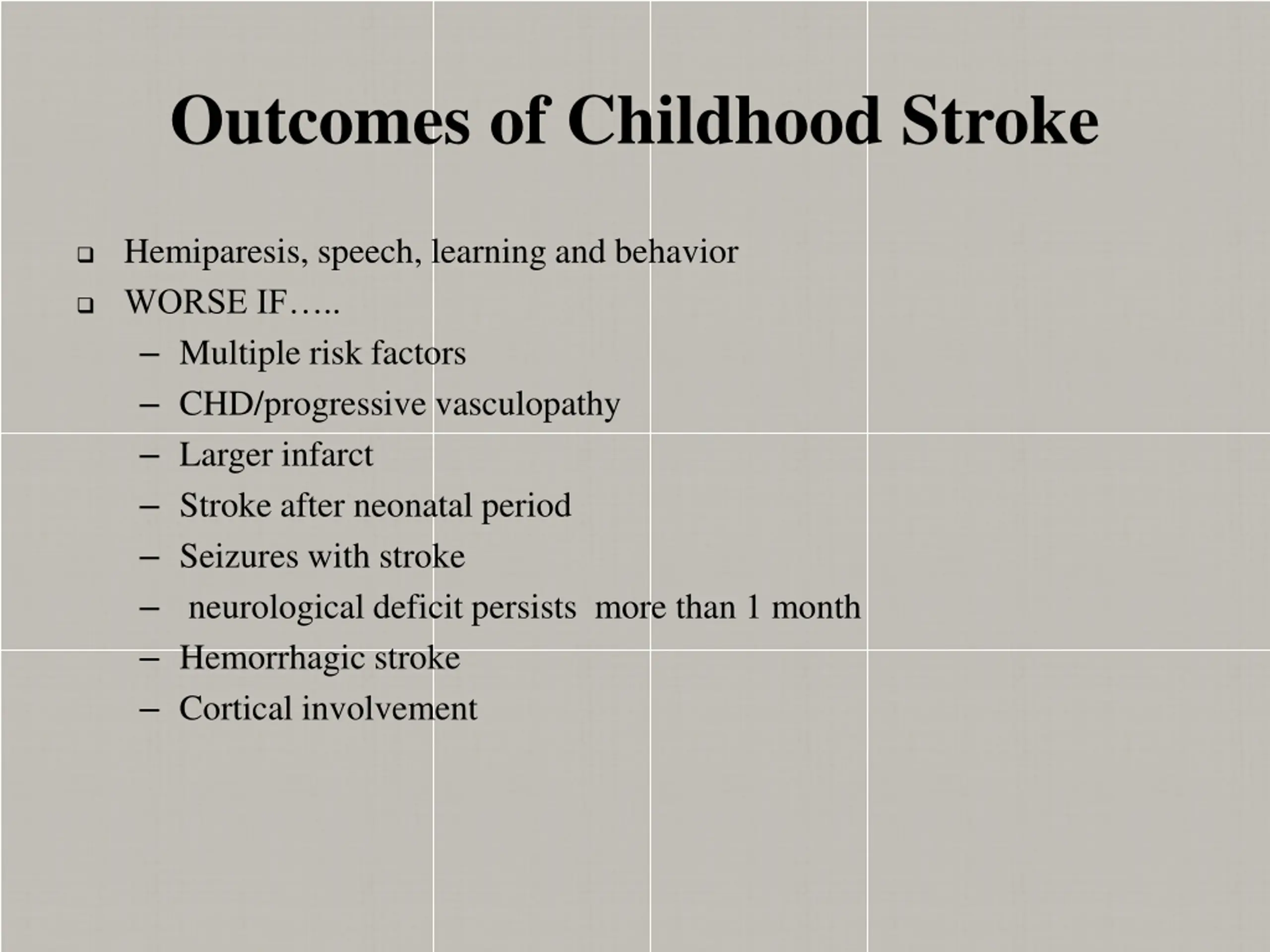 Outcomes of Childhood Stroke Hemiparesis, speech, learning and behavior WORSE IF .. Multiple risk factors CHD/progressive vasculopathy Larger infarct Stroke after neonatal period Seizures with stroke neurological deficit persists more than 1 month Hemorrhagic stroke Cortical involvement