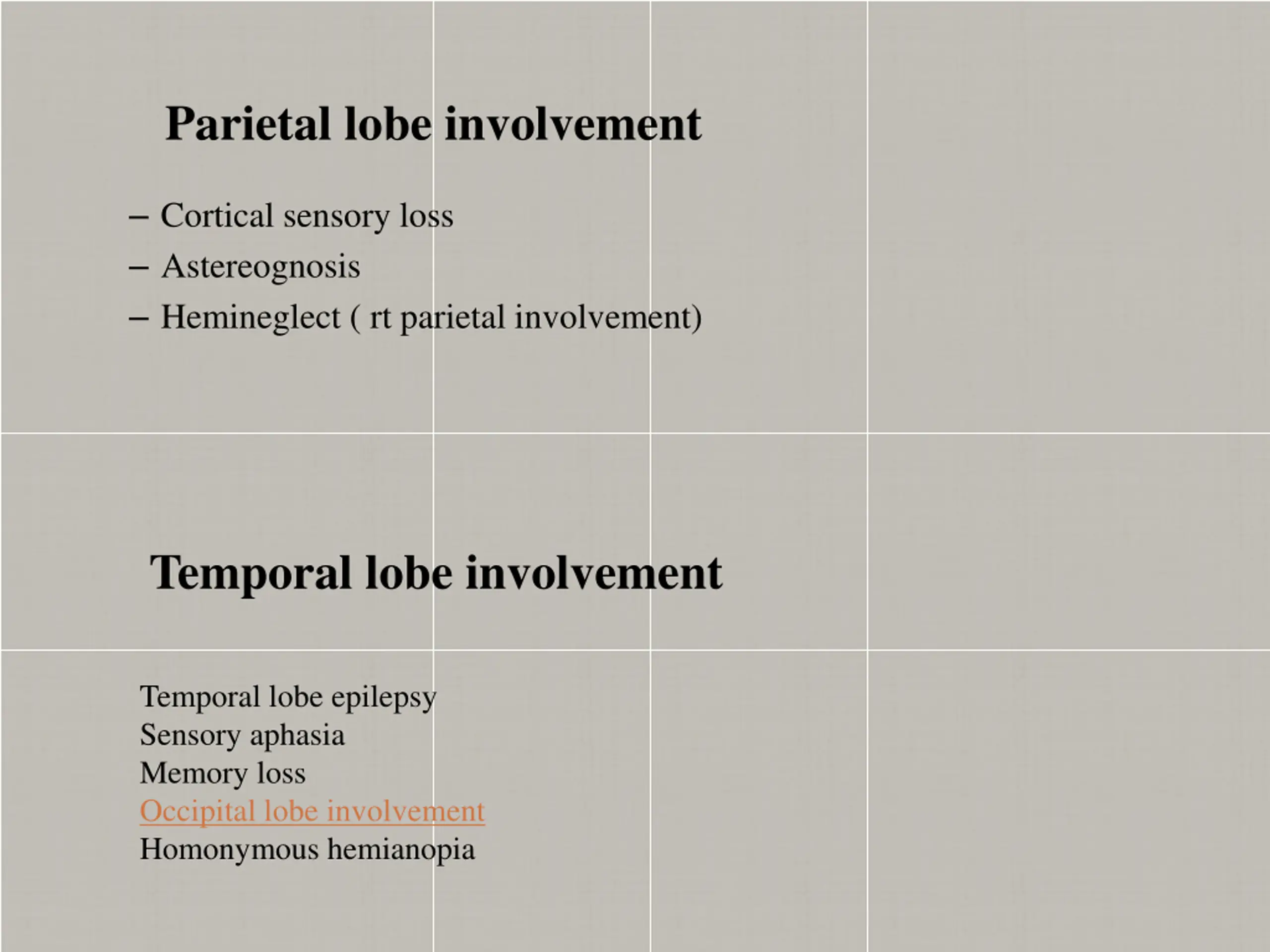 Parietal lobe involvement Cortical sensory loss Astereognosis Hemineglect ( rt parietal involvement) Temporal lobe involvement Temporal lobe epilepsy Sensory aphasia Memory loss Occipital lobe involvement Homonymous hemianopia