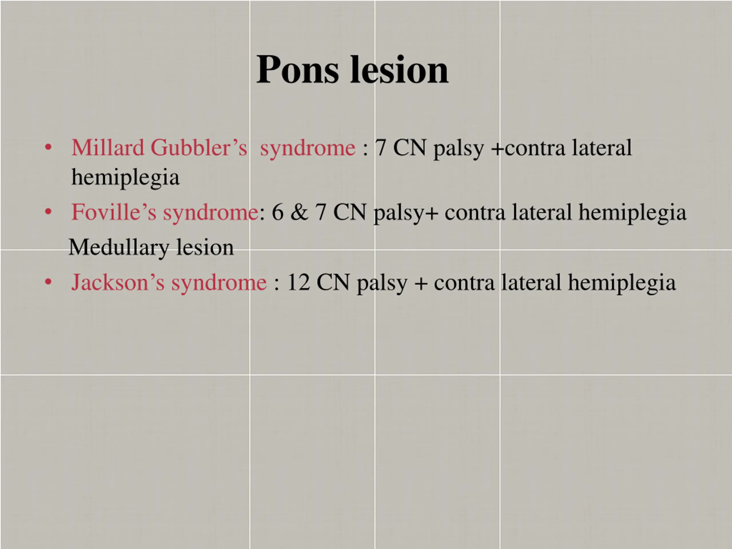 Pons lesion Millard Gubbler s syndrome : 7 CN palsy +contra lateral hemiplegia Foville s syndrome: 6 & 7 CN palsy+ contra lateral hemiplegia Medullary lesion Jackson s syndrome : 12 CN palsy + contra lateral hemiplegia
