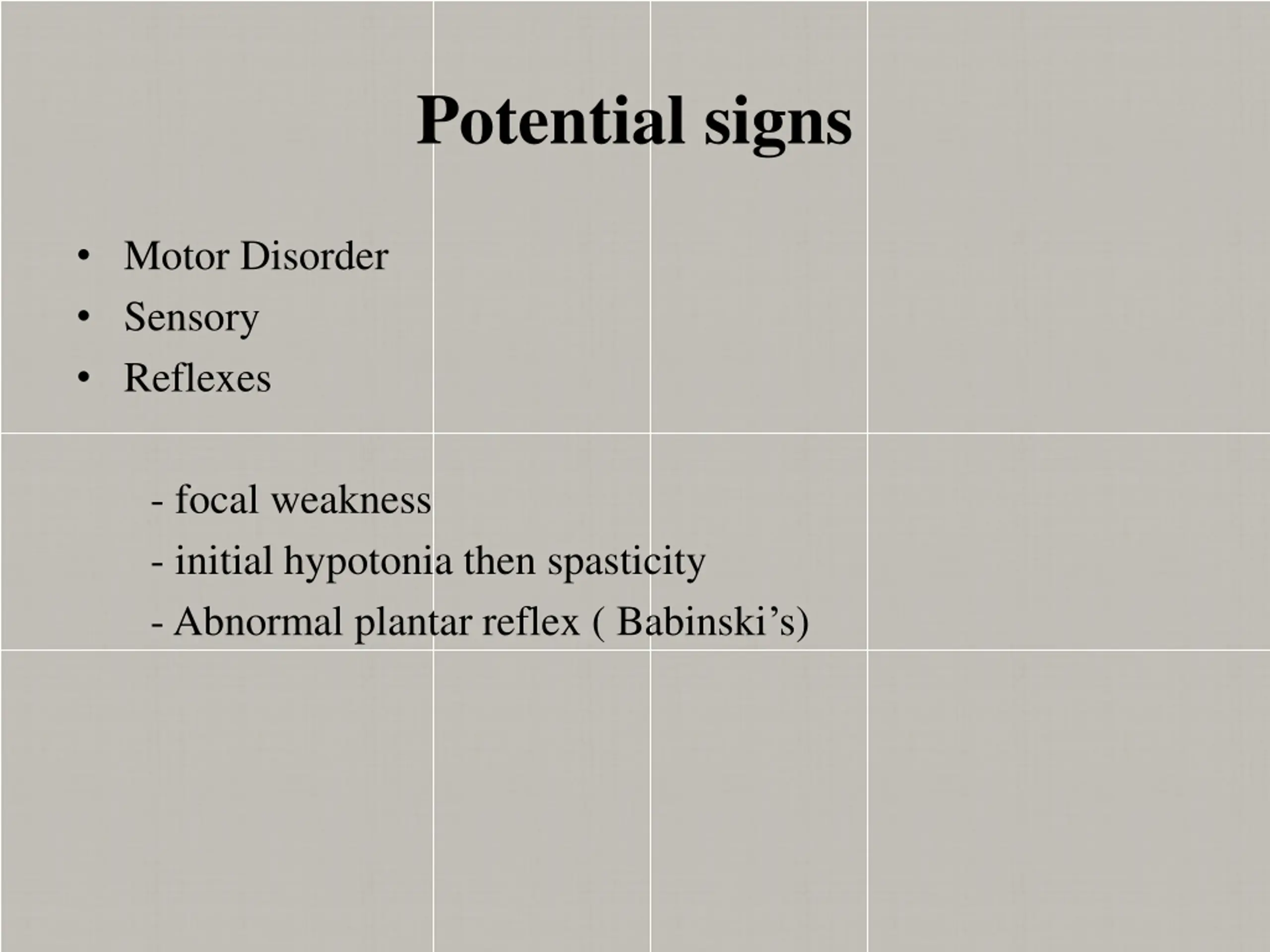 Potential signs Motor Disorder Sensory Reflexes - focal weakness - initial hypotonia then spasticity - Abnormal plantar reflex ( Babinski s)