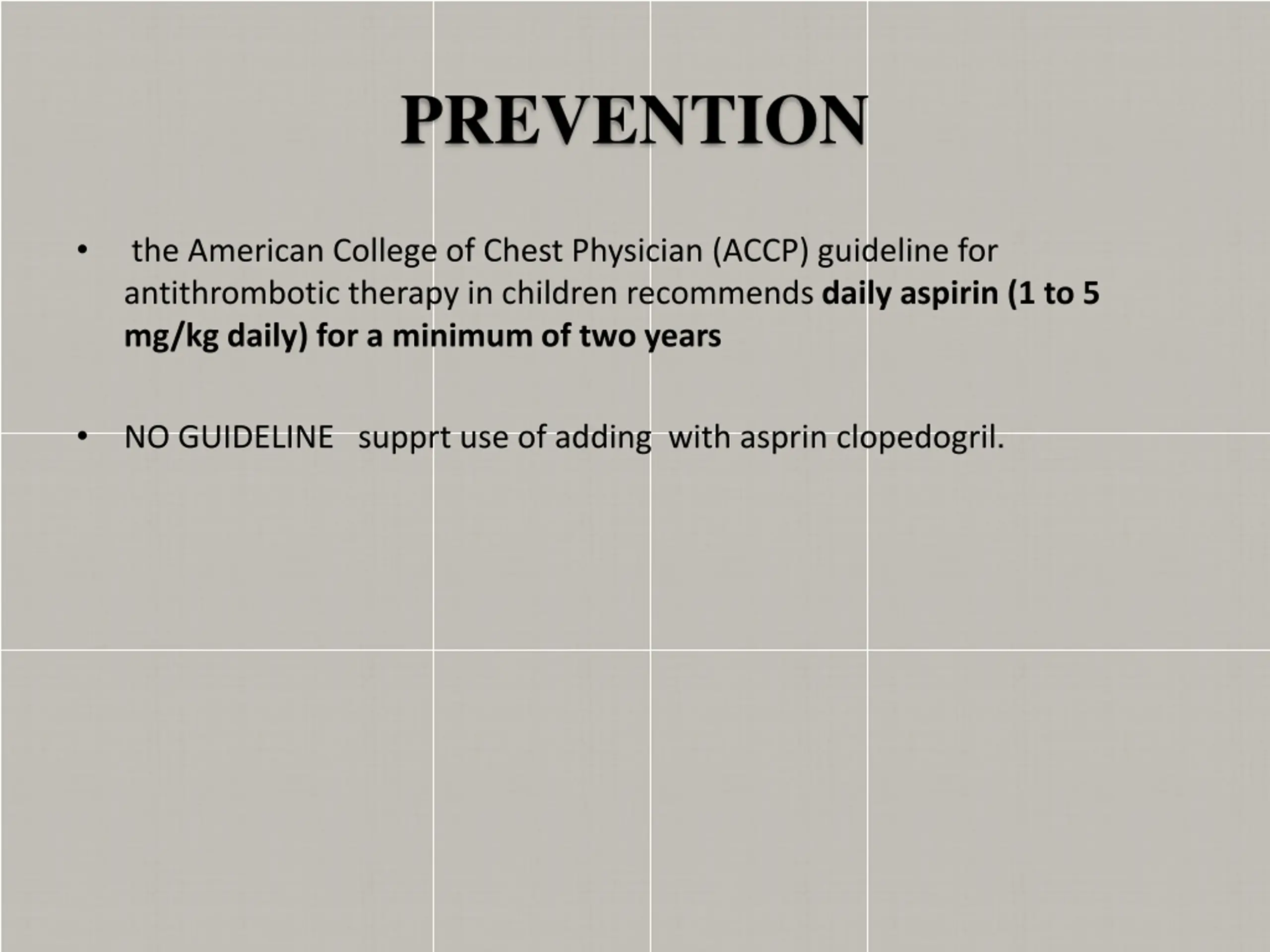 PREVENTION the American College of Chest Physician (ACCP) guideline for antithrombotic therapy in children recommends daily aspirin (1 to 5 mg/kg daily) for a minimum of two years NO GUIDELINE supprt use of adding with asprin clopedogril.
