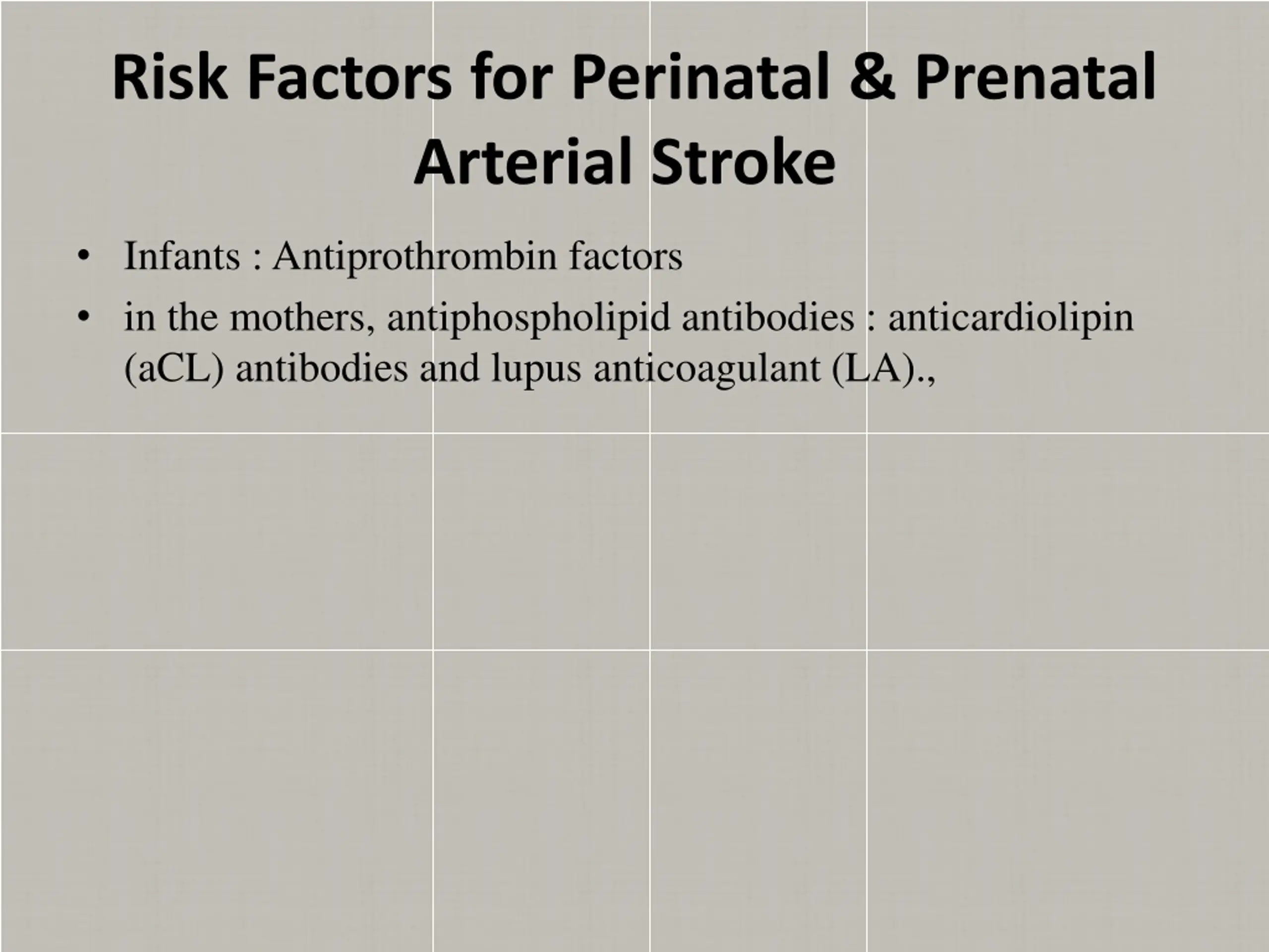 Risk Factors for Perinatal & Prenatal Arterial Stroke Infants : Antiprothrombin factors in the mothers, antiphospholipid antibodies : anticardiolipin (aCL) antibodies and lupus anticoagulant (LA).,