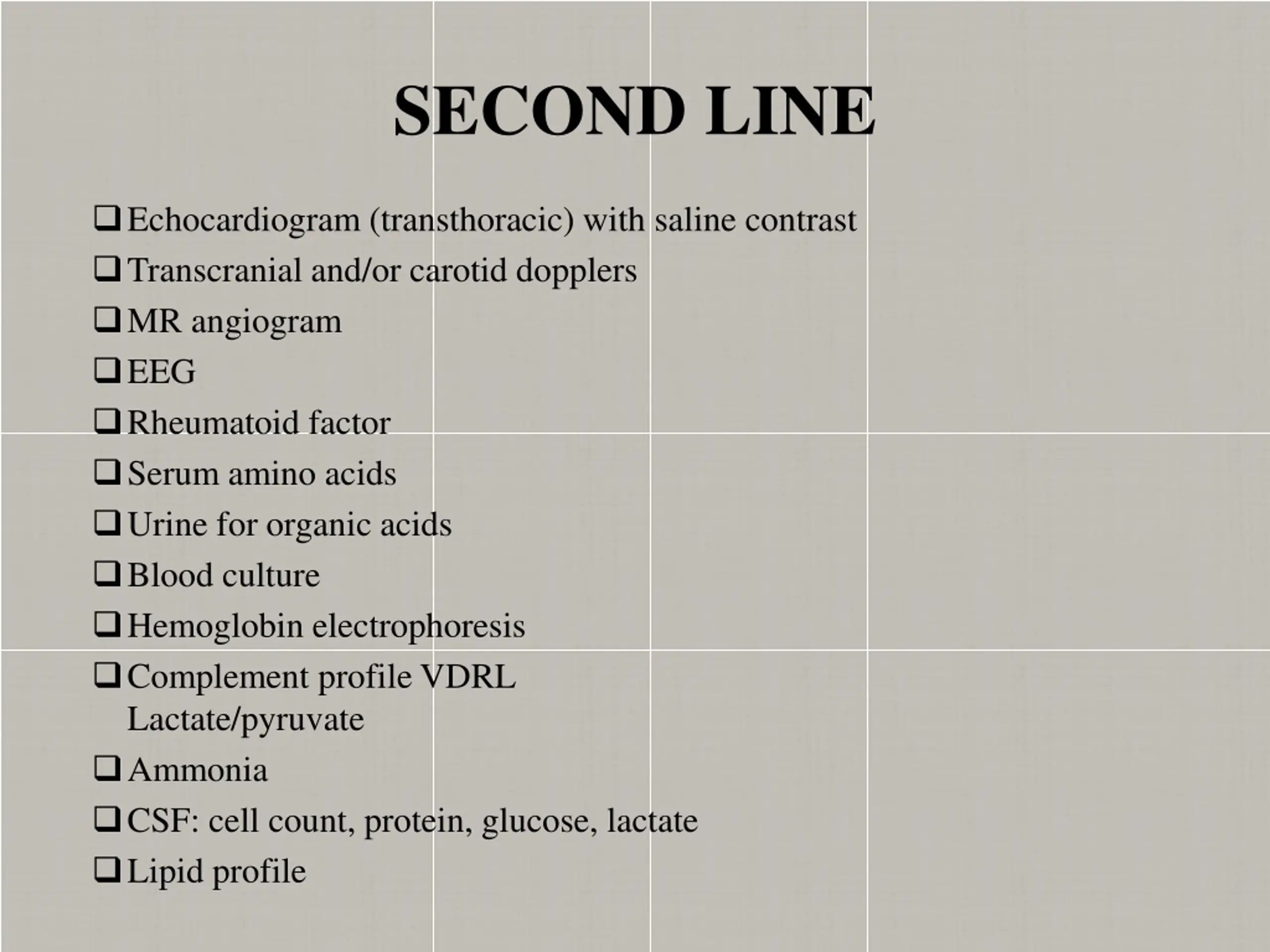 SECOND LINE Echocardiogram (transthoracic) with saline contrast Transcranial and/or carotid dopplers MR angiogram EEG Rheumatoid factor Serum amino acids Urine for organic acids Blood culture Hemoglobin electrophoresis Complement profile VDRL Lactate/pyruvate Ammonia CSF: cell count, protein, glucose, lactate Lipid profile