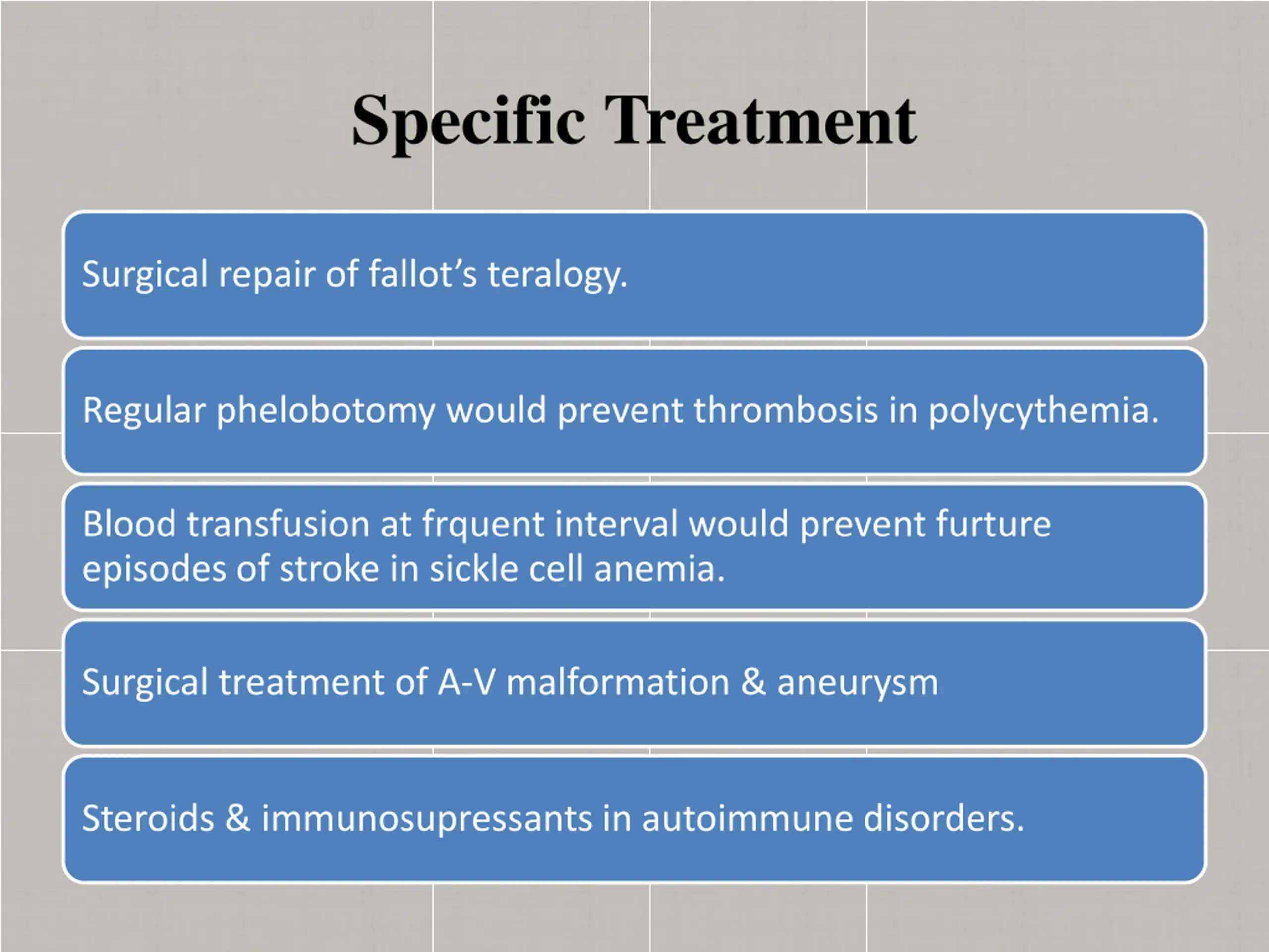 Specific Treatment Surgical repair of fallot s teralogy. Regular phelobotomy would prevent thrombosis in polycythemia. Blood transfusion at frquent interval would prevent furture episodes of stroke in sickle cell anemia. Surgical treatment of A-V malformation & aneurysm Steroids & immunosupressants in autoimmune disorders.