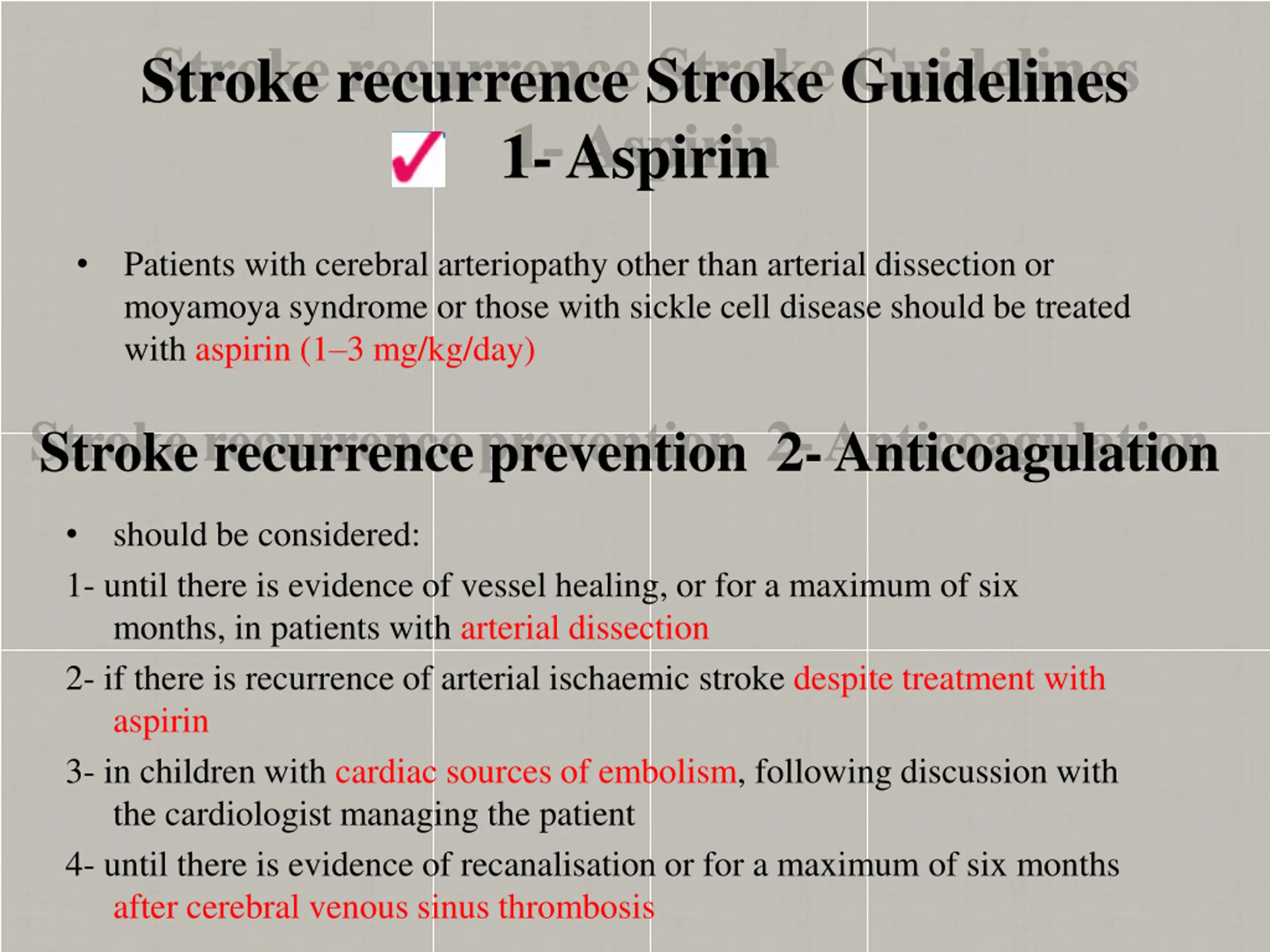 Stroke recurrence Stroke Guidelines 1- Aspirin Patients with cerebral arteriopathy other than arterial dissection or moyamoya syndrome or those with sickle cell disease should be treated with aspirin (1 3 mg/kg/day) Stroke recurrence prevention 2- Anticoagulation should be considered: 1- until there is evidence of vessel healing, or for a maximum of six months, in patients with arterial dissection 2- if there is recurrence of arterial ischaemic stroke despite treatment with aspirin 3- in children with cardiac sources of embolism, following discussion with the cardiologist managing the patient 4- until there is evidence of recanalisation or for a maximum of six months after cerebral venous sinus thrombosis