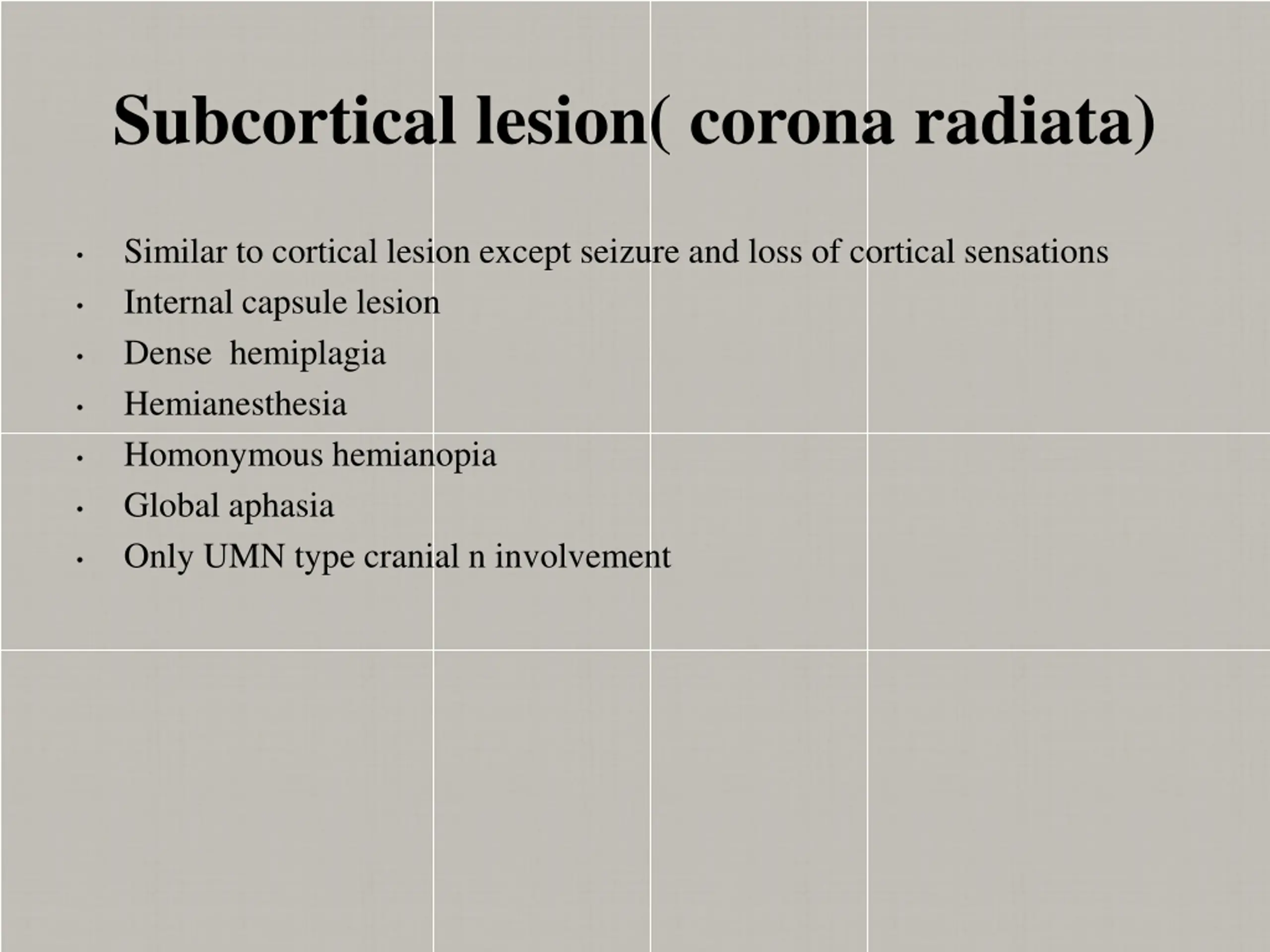 Subcortical lesion( corona radiata) Similar to cortical lesion except seizure and loss of cortical sensations Internal capsule lesion Dense hemiplagia Hemianesthesia Homonymous hemianopia Global aphasia Only UMN type cranial n involvement