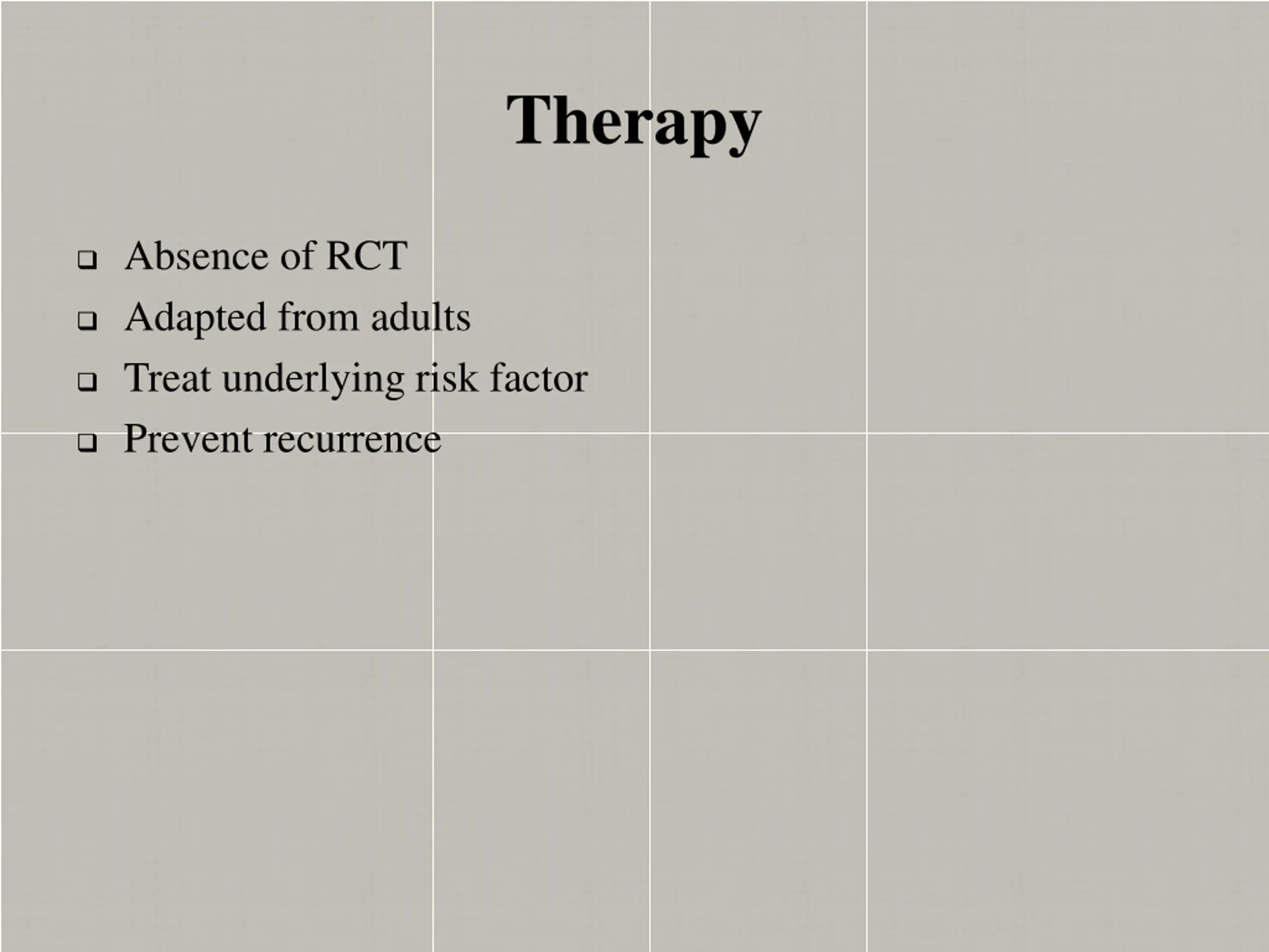 Therapy Absence of RCT Adapted from adults Treat underlying risk factor Prevent recurrence