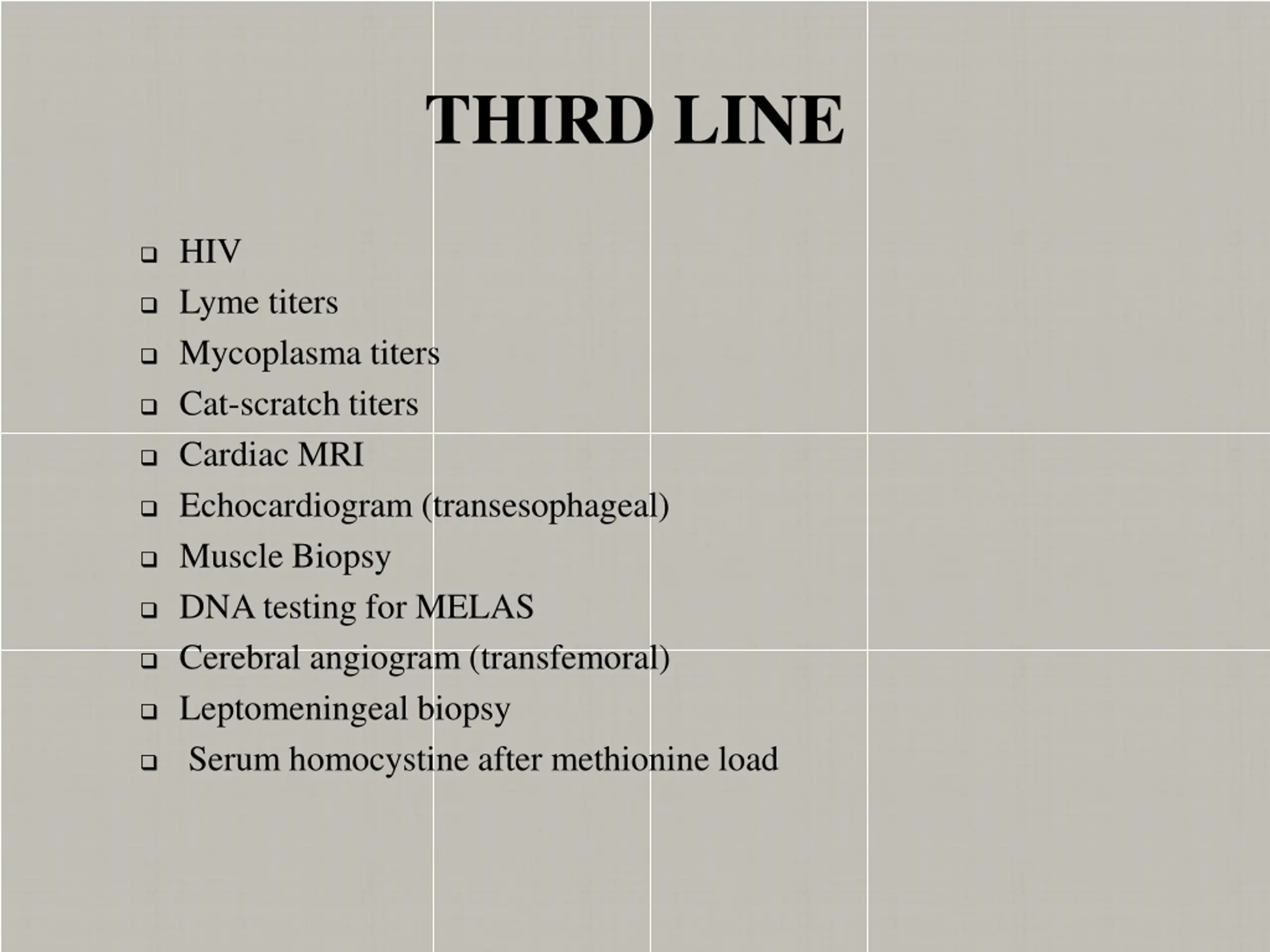 THIRD LINE HIV Lyme titers Mycoplasma titers Cat-scratch titers Cardiac MRI Echocardiogram (transesophageal) Muscle Biopsy DNA testing for MELAS Cerebral angiogram (transfemoral) Leptomeningeal biopsy Serum homocystine after methionine load