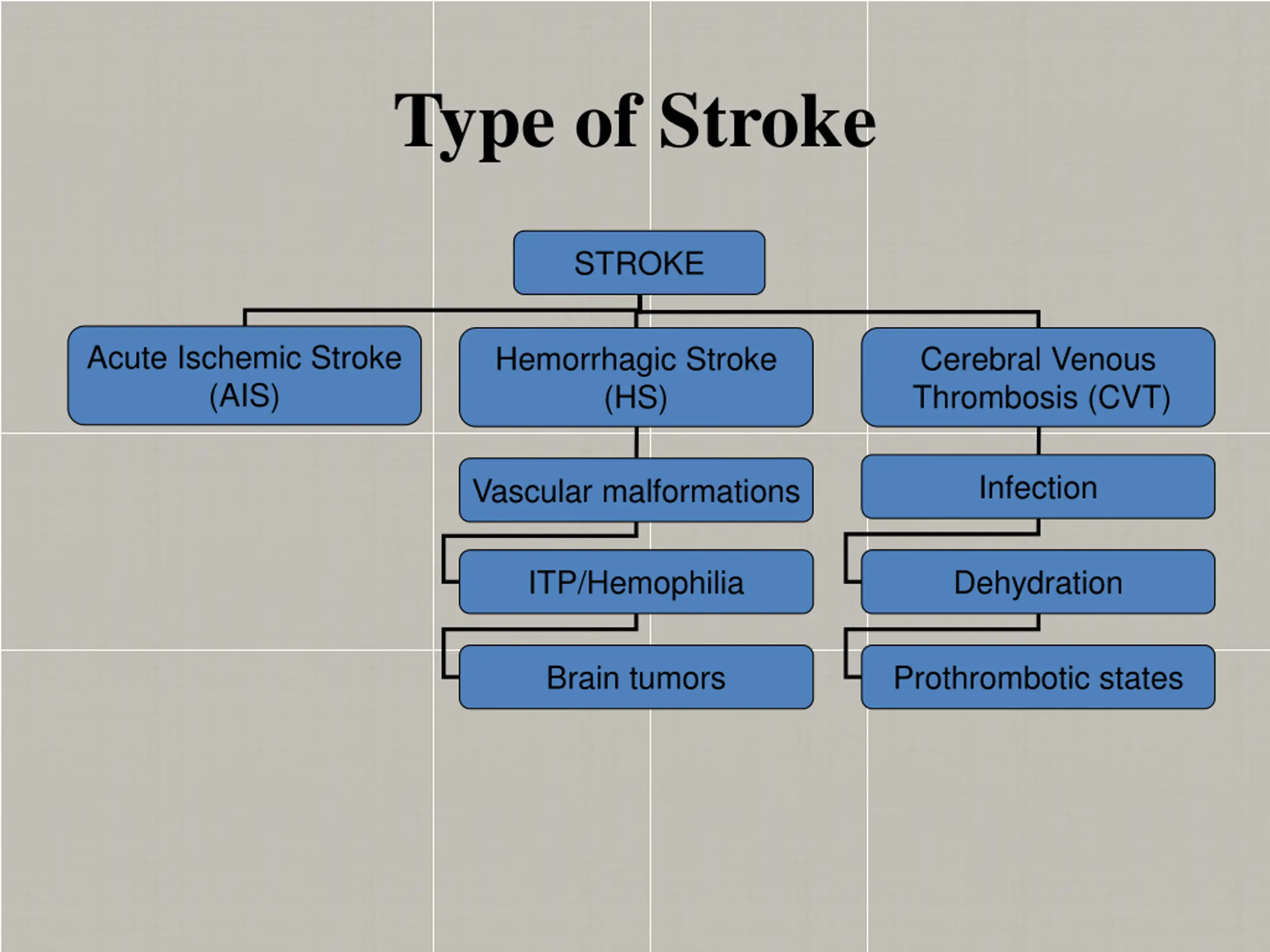 Type of Stroke STROKE Acute Ischemic Stroke (AIS) Hemorrhagic Stroke (HS) Cerebral Venous Thrombosis (CVT) Infection Vascular malformations ITP/Hemophilia Dehydration Brain tumors Prothrombotic states