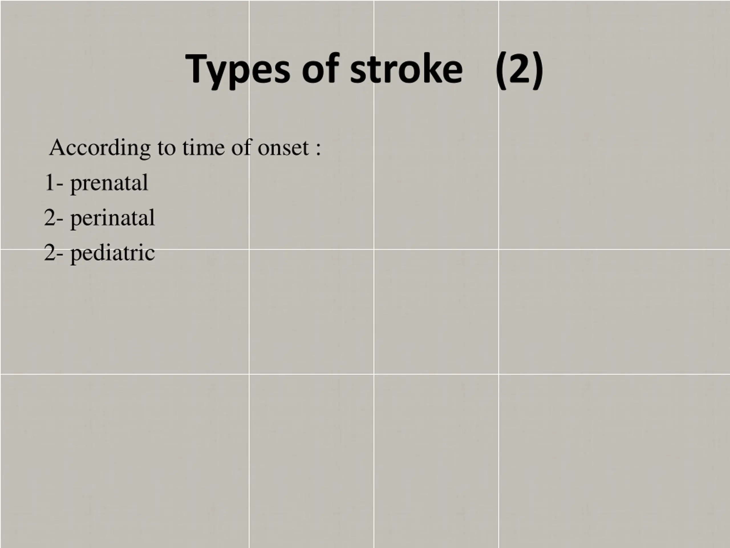 Types of stroke (2) According to time of onset : 1- prenatal 2- perinatal 2- pediatric