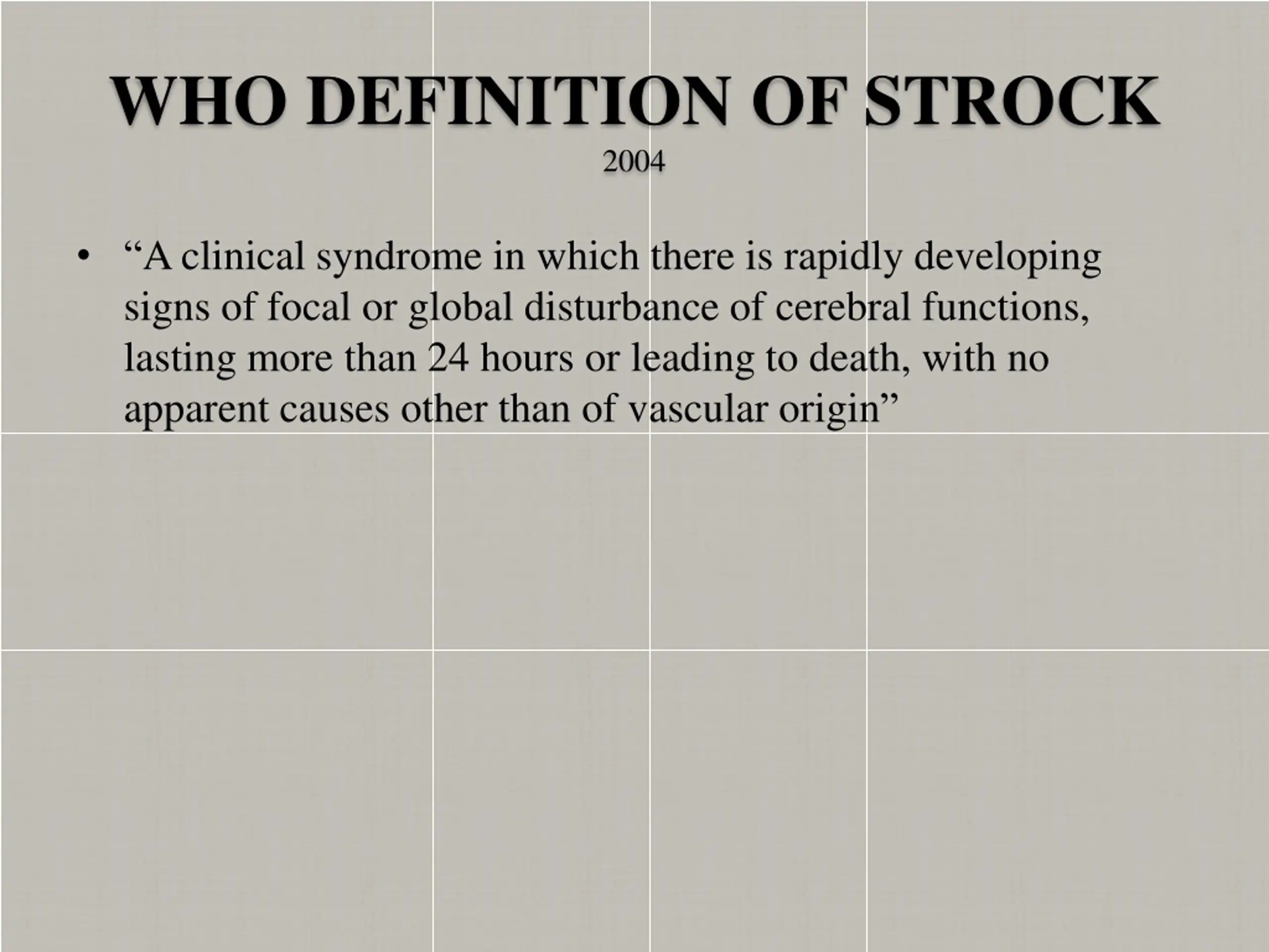WHO DEFINITION OF STROCK 2004 A clinical syndrome in which there is rapidly developing signs of focal or global disturbance of cerebral functions, lasting more than 24 hours or leading to death, with no apparent causes other than of vascular origin