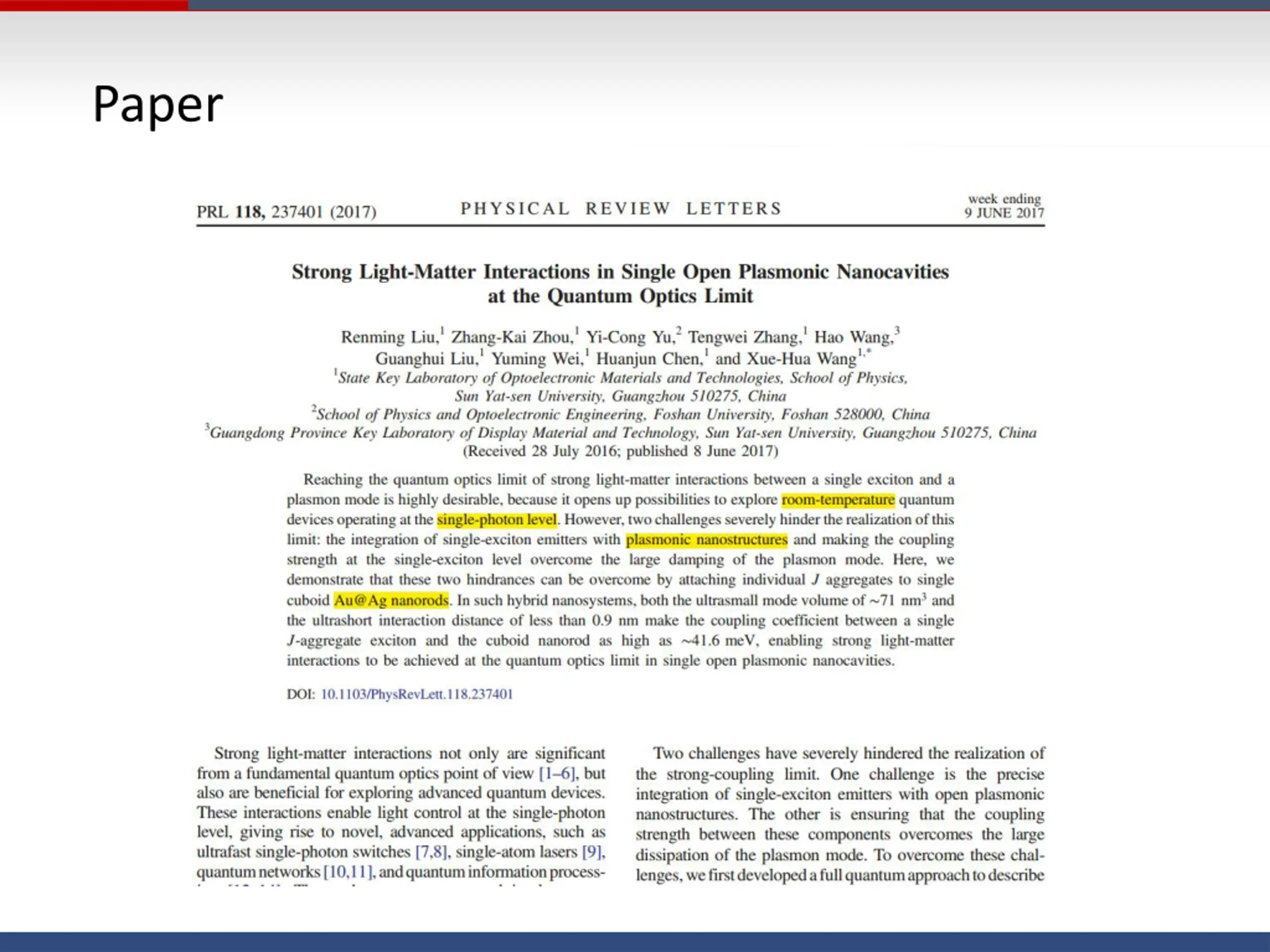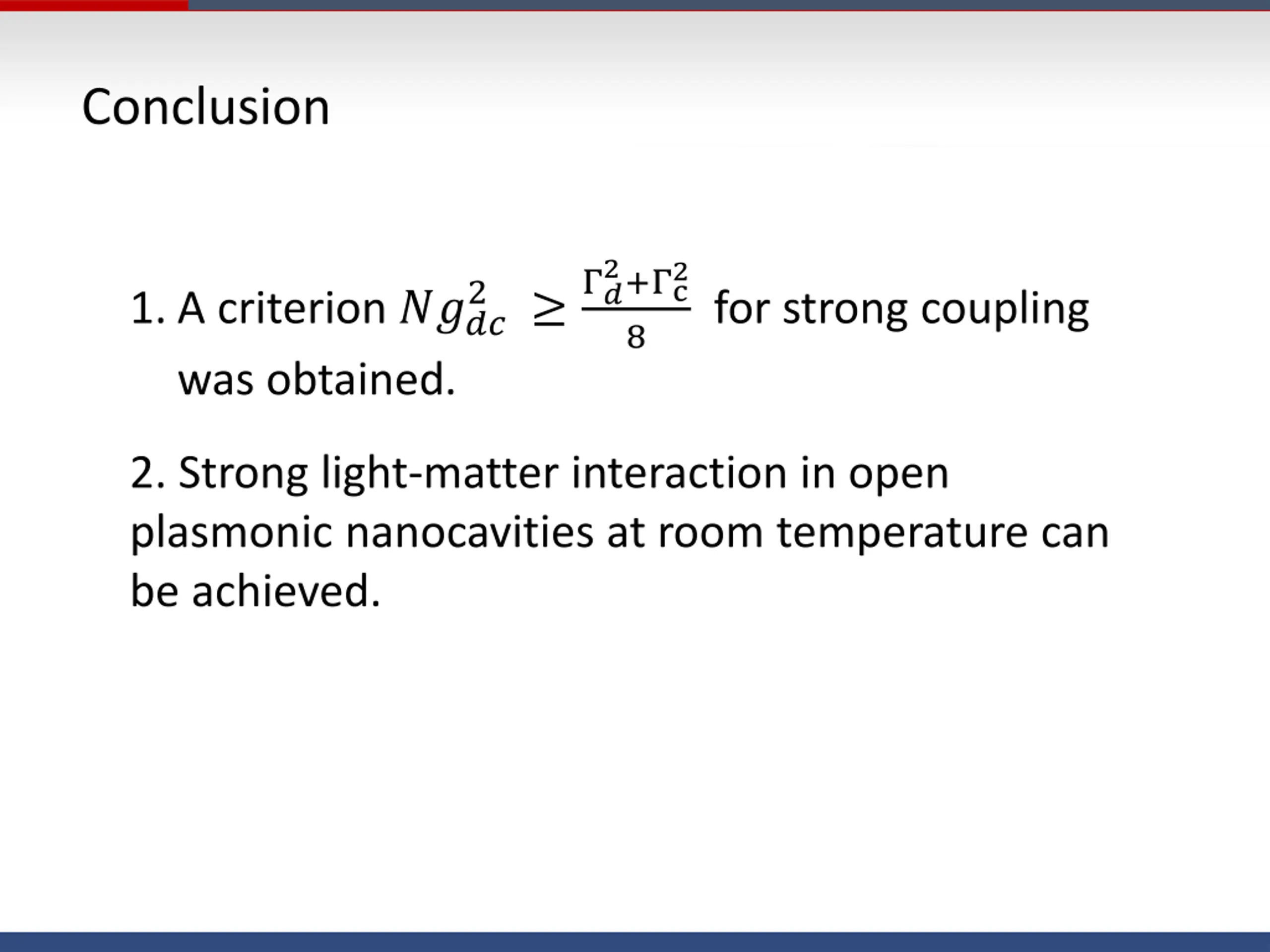 Conclusion 2+ c2 8 ? 2 1. A criterion ???? was obtained. for strong coupling 2. Strong light-matter interaction in open plasmonic nanocavities at room temperature can be achieved.