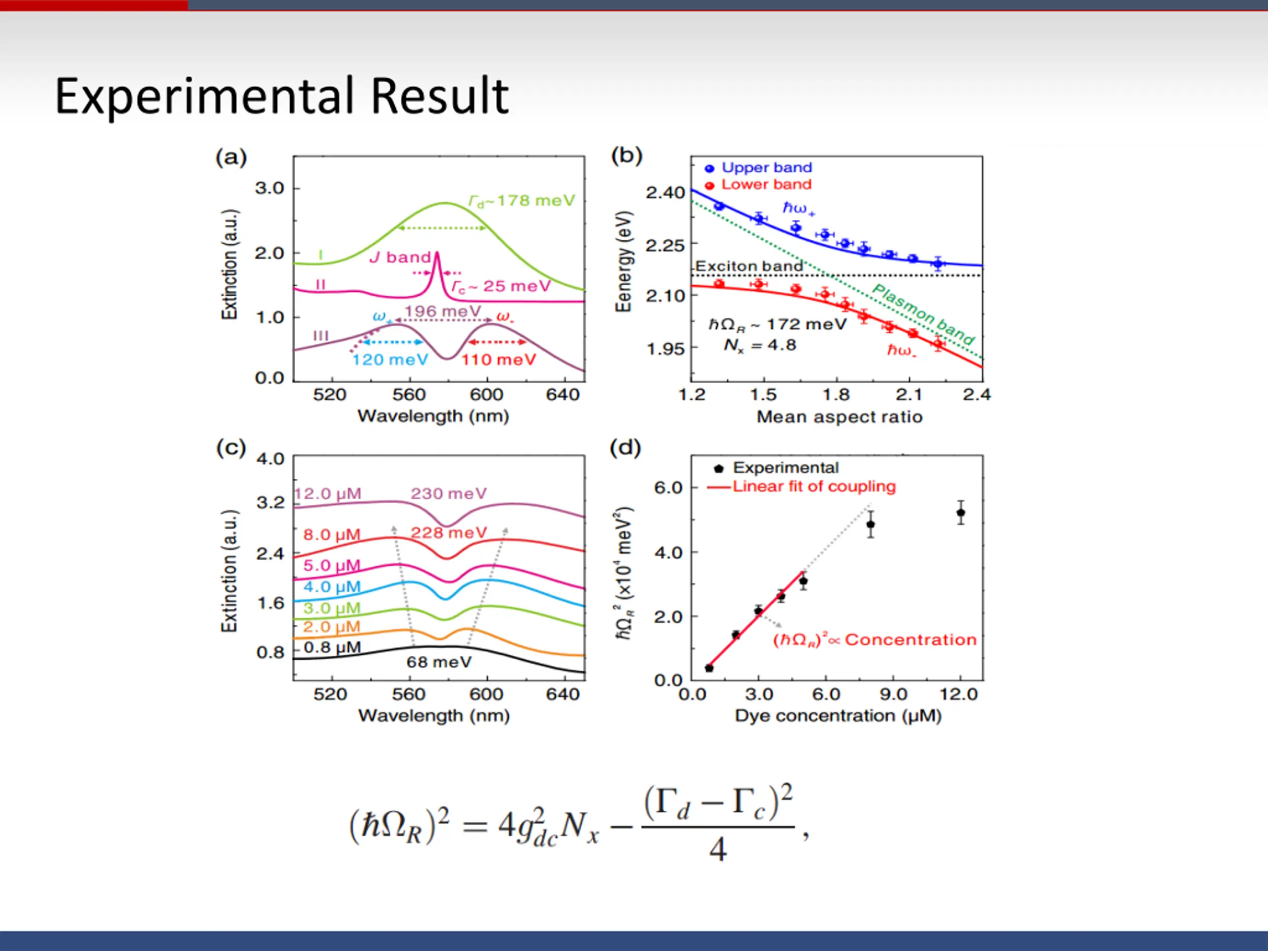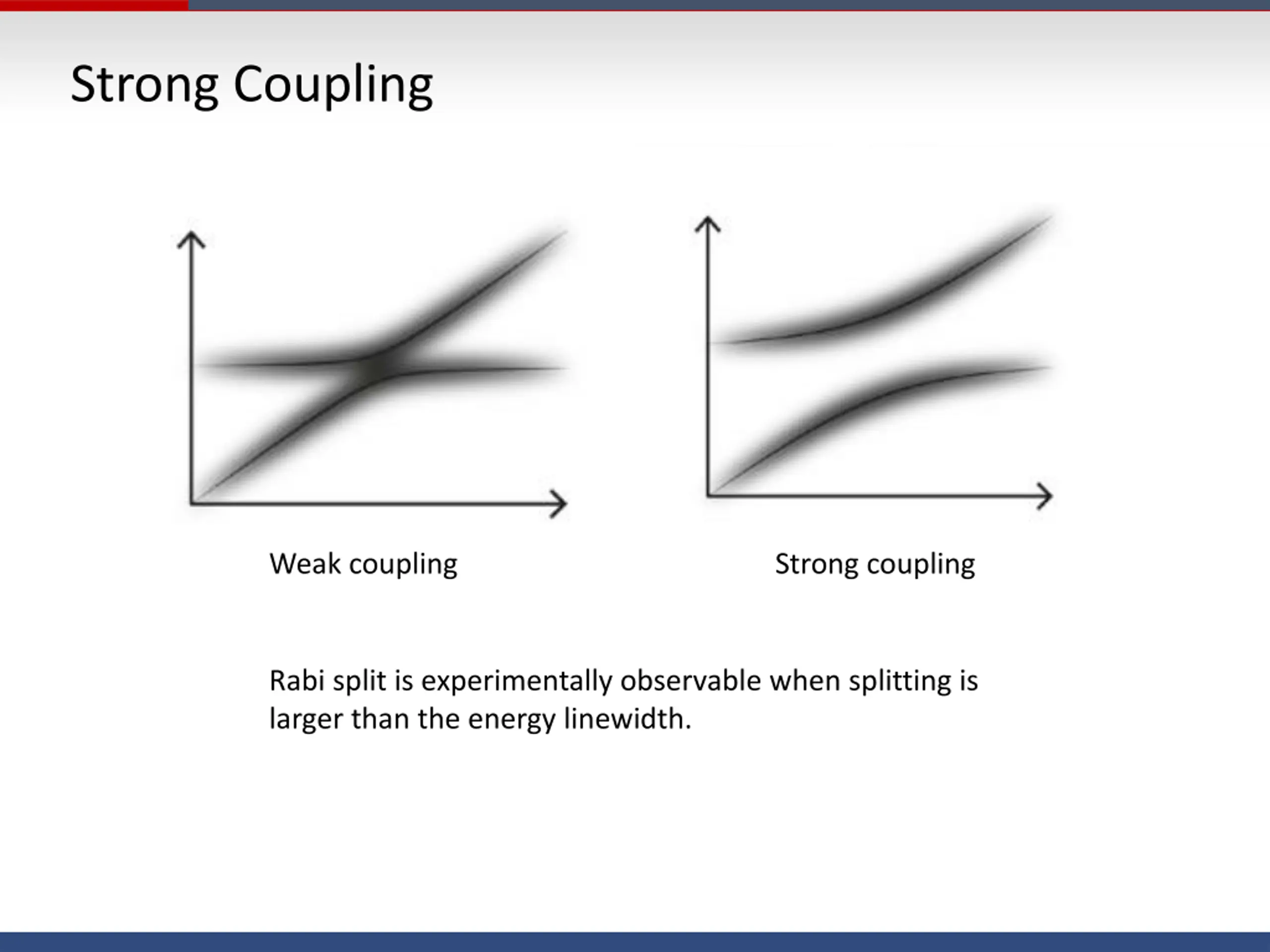 Strong Coupling Weak coupling Strong coupling Rabi split is experimentally observable when splitting is larger than the energy linewidth.