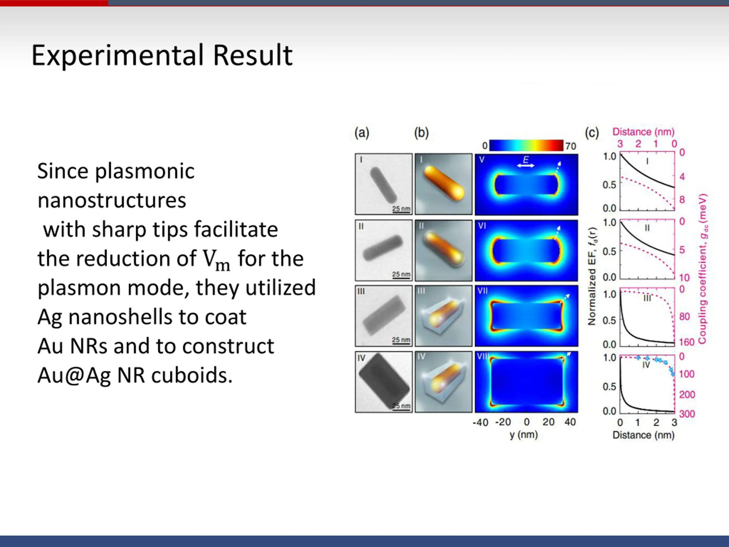Experimental Result Since plasmonic nanostructures with sharp tips facilitate the reduction of Vmfor the plasmon mode, they utilized Ag nanoshells to coat Au NRs and to construct Au@Ag NR cuboids.