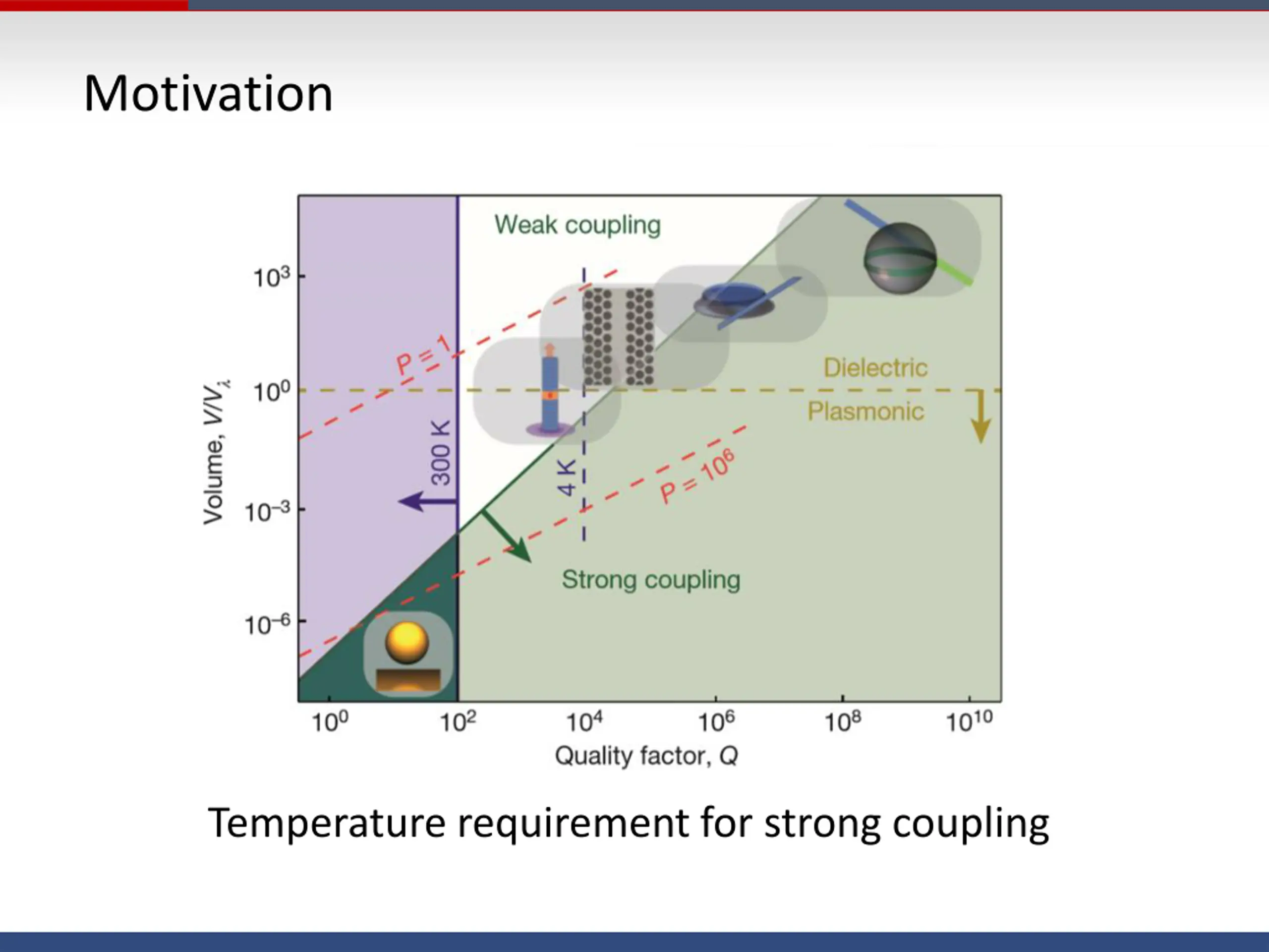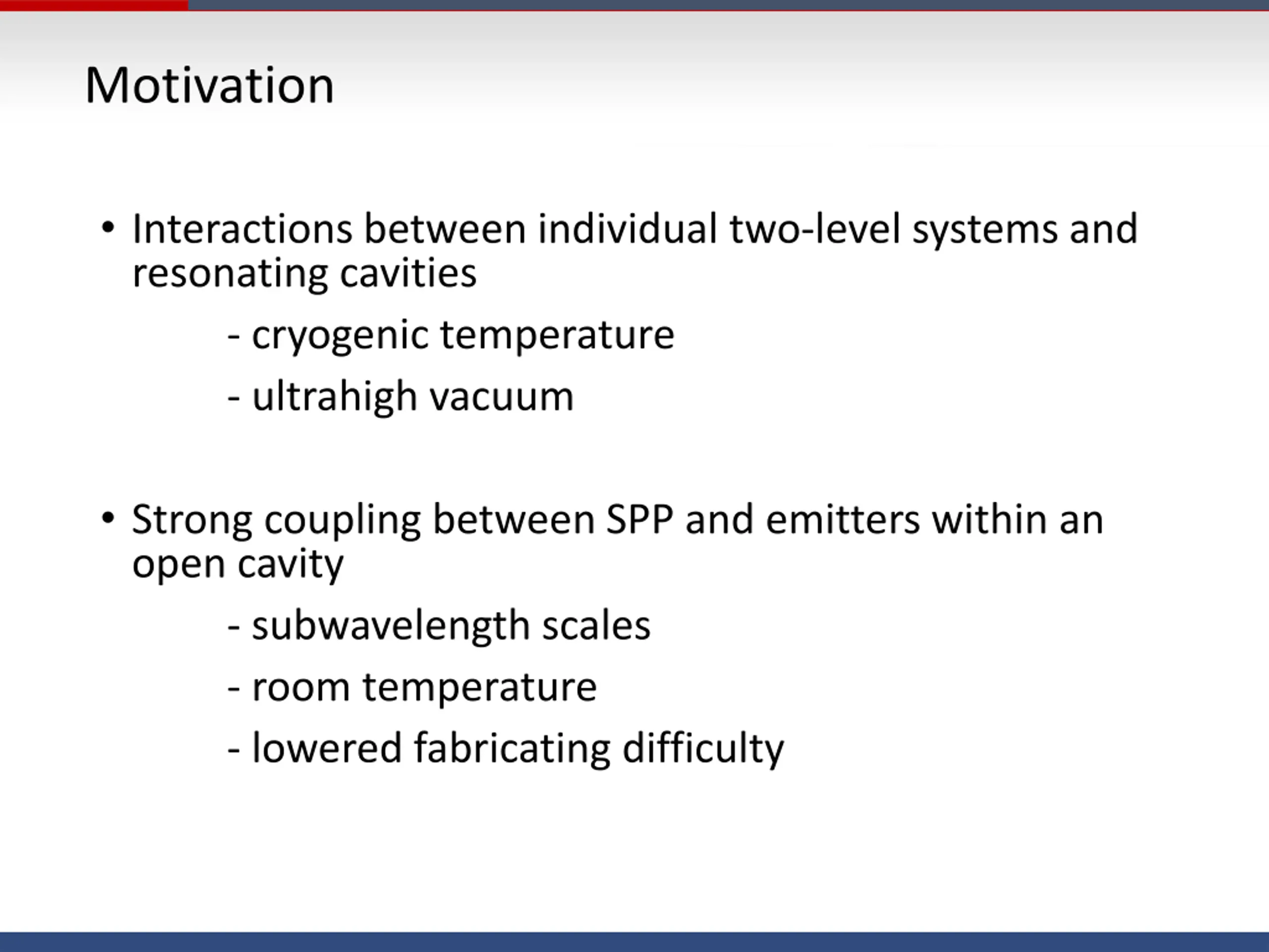 Motivation Interactions between individual two-level systems and resonating cavities - cryogenic temperature - ultrahigh vacuum Strong coupling between SPP and emitters within an open cavity - subwavelength scales - room temperature - lowered fabricating difficulty