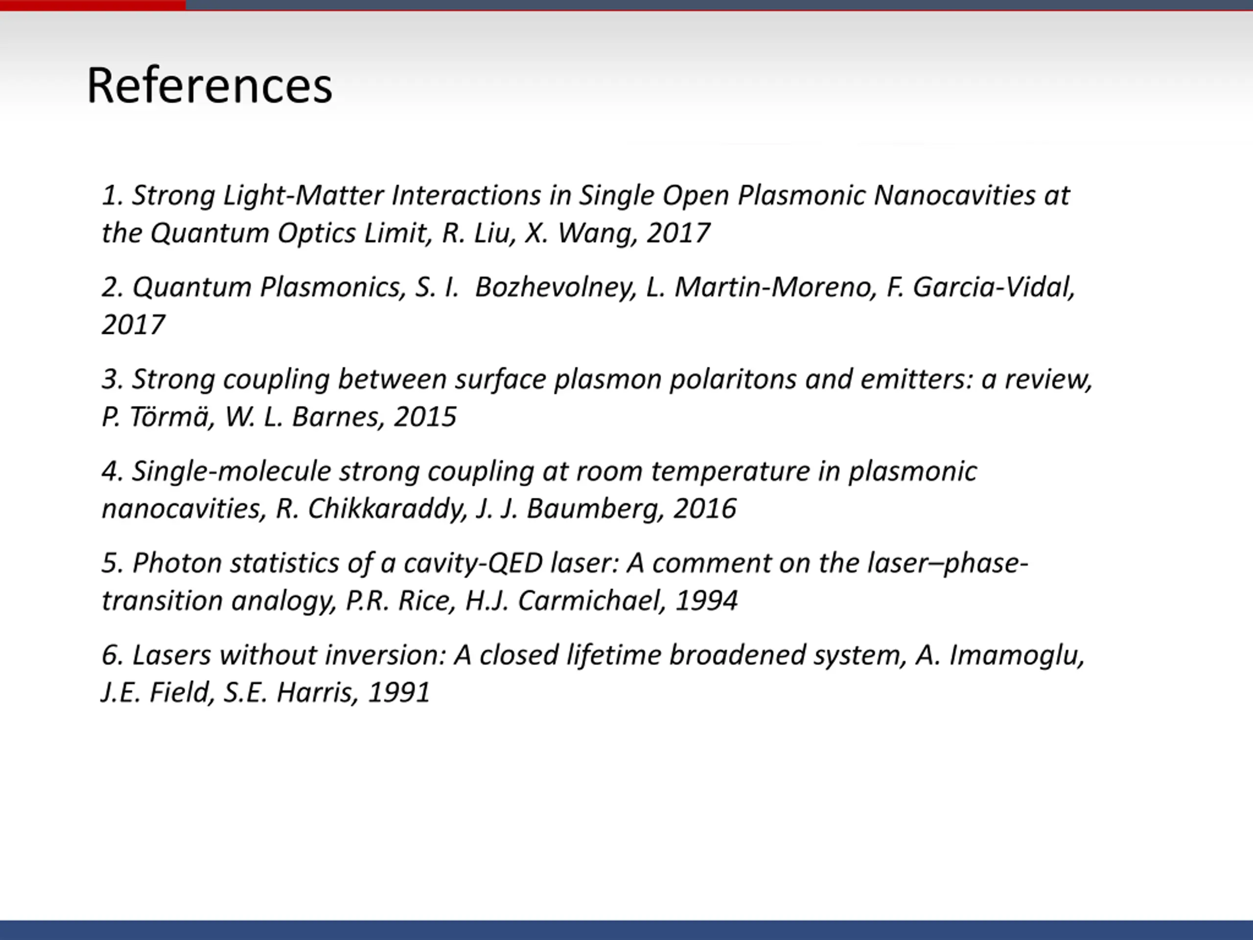 References 1. Strong Light-Matter Interactions in Single Open Plasmonic Nanocavities at the Quantum Optics Limit, R. Liu, X. Wang, 2017 2. Quantum Plasmonics, S. I. Bozhevolney, L. Martin-Moreno, F. Garcia-Vidal, 2017 3. Strong coupling between surface plasmon polaritons and emitters: a review, P. T rm , W. L. Barnes, 2015 4. Single-molecule strong coupling at room temperature in plasmonic nanocavities, R. Chikkaraddy, J. J. Baumberg, 2016 5. Photon statistics of a cavity-QED laser: A comment on the laser phase- transition analogy, P.R. Rice, H.J. Carmichael, 1994 6. Lasers without inversion: A closed lifetime broadened system, A. Imamoglu, J.E. Field, S.E. Harris, 1991