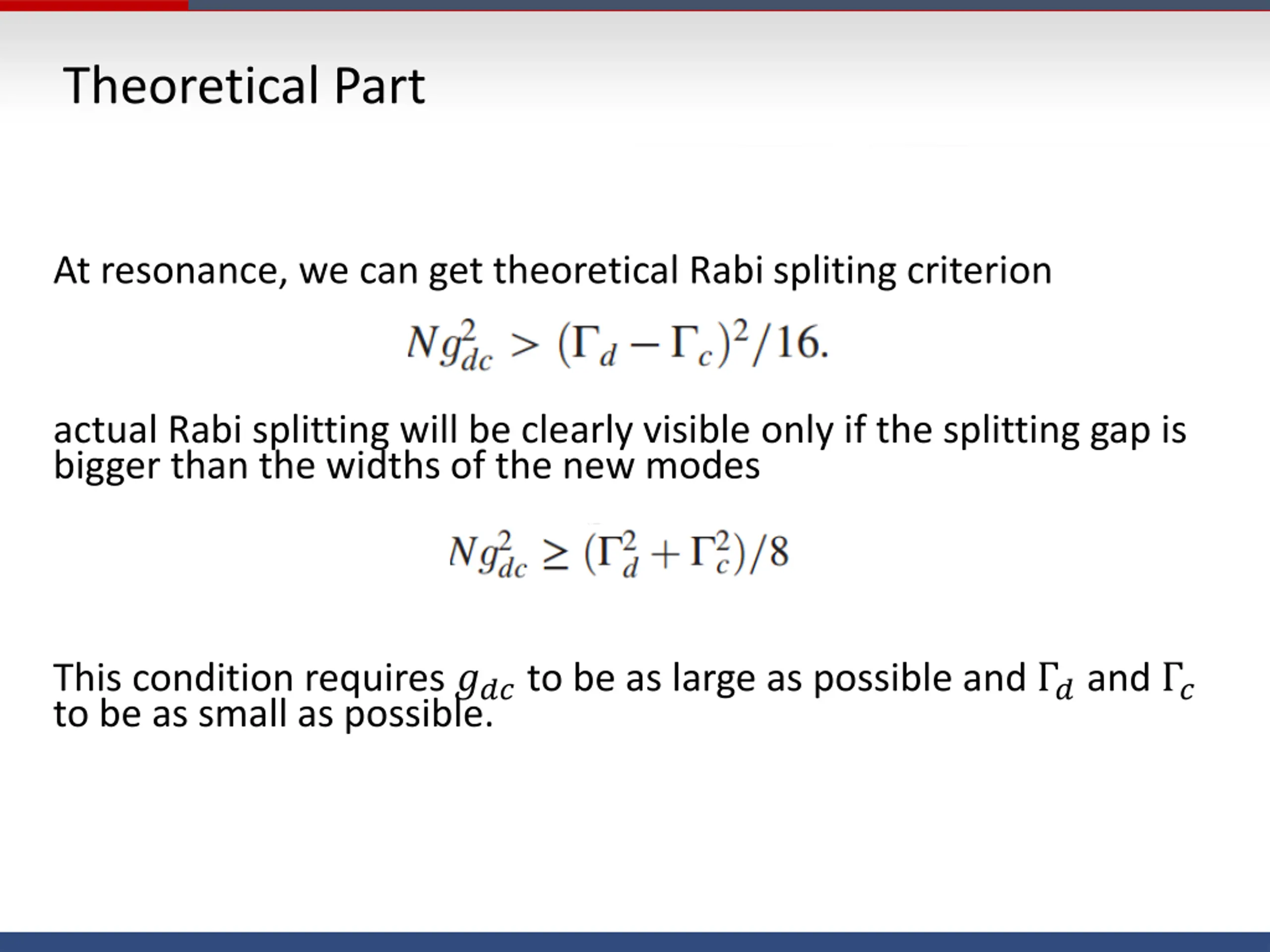 Theoretical Part At resonance, we can get theoretical Rabi spliting criterion actual Rabi splitting will be clearly visible only if the splitting gap is bigger than the widths of the new modes This condition requires ???to be as large as possible and ?and ? to be as small as possible.