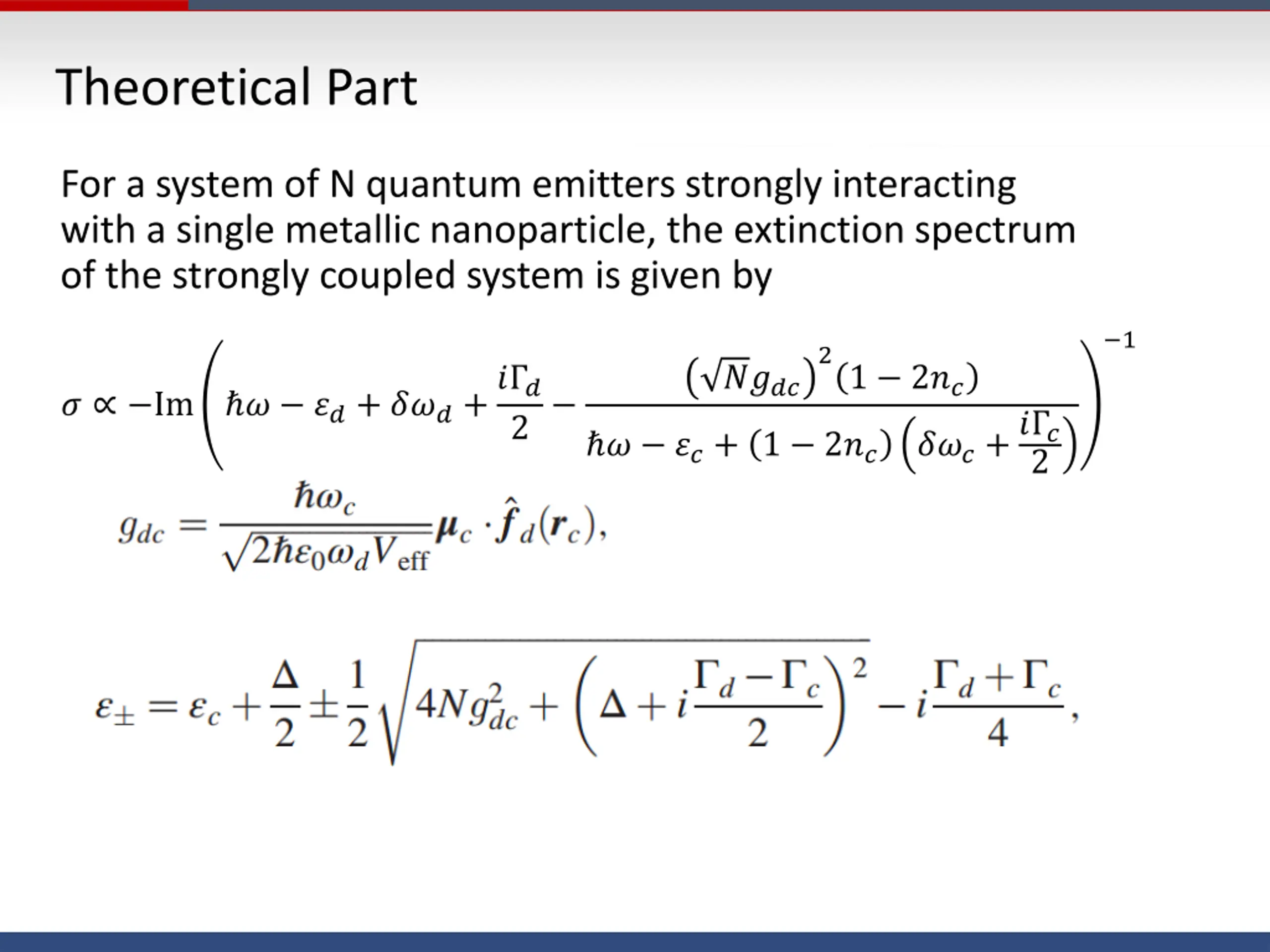 Theoretical Part For a system of N quantum emitters strongly interacting with a single metallic nanoparticle, the extinction spectrum of the strongly coupled system is given by 1 21 2?? ???? ? Im ? ??+ ???+? ? ???+? ? 2 ? ??+ 1 2?? 2