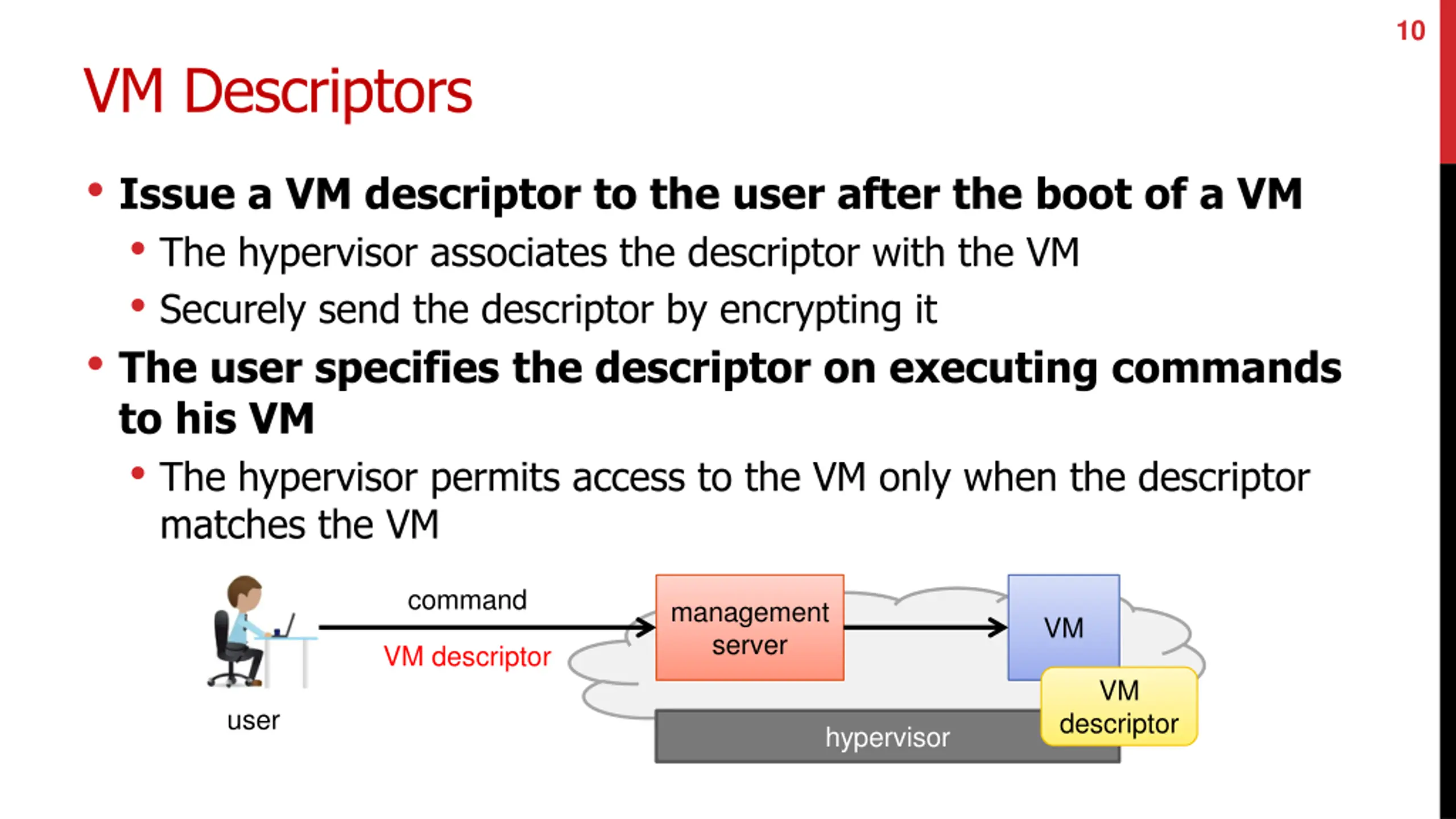 10 VM Descriptors Issue a VM descriptor to the user after the boot of a VM The hypervisor associates the descriptor with the VM Securely send the descriptor by encrypting it The user specifies the descriptor on executing commands to his VM The hypervisor permits access to the VM only when the descriptor matches the VM command management server VM VM descriptor VM user descriptor hypervisor