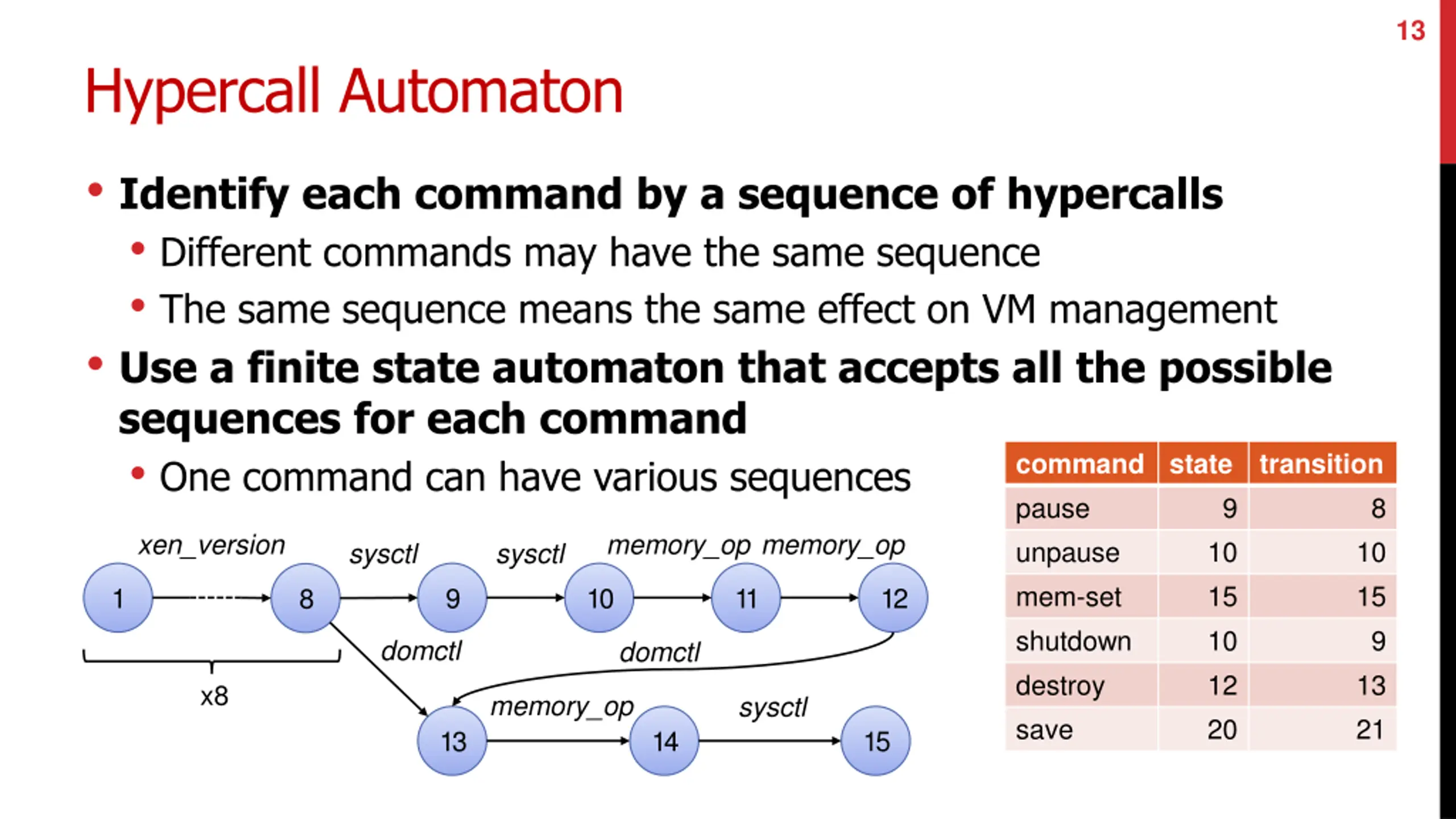 12 Semantic Gap The hypervisor cannot directly recognize user's high-level commands It can recognize only low-level hypercalls issued by commands Each command usually consists of a set of hypercalls Difficult to associate a VM descriptor only with correct hypercalls The hypervisor could not detect hypercall injection VM descriptor command VM hypercall user hypervisor