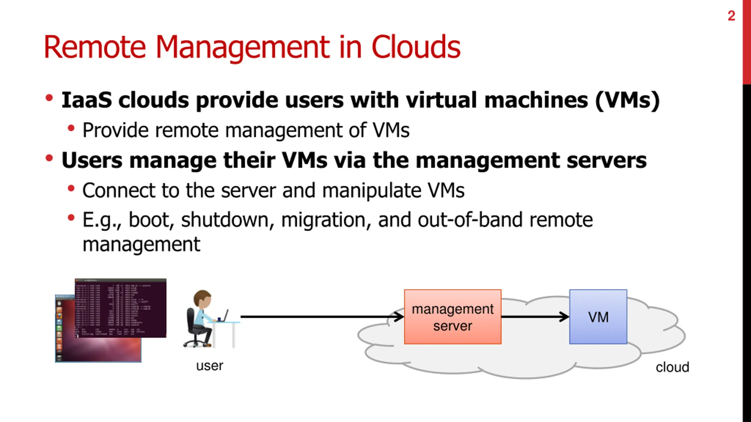 2 Remote Management in Clouds IaaS clouds provide users with virtual machines (VMs) Provide remote management of VMs Users manage their VMs via the management servers Connect to the server and manipulate VMs E.g., boot, shutdown, migration, and out-of-band remote management management server VM user cloud