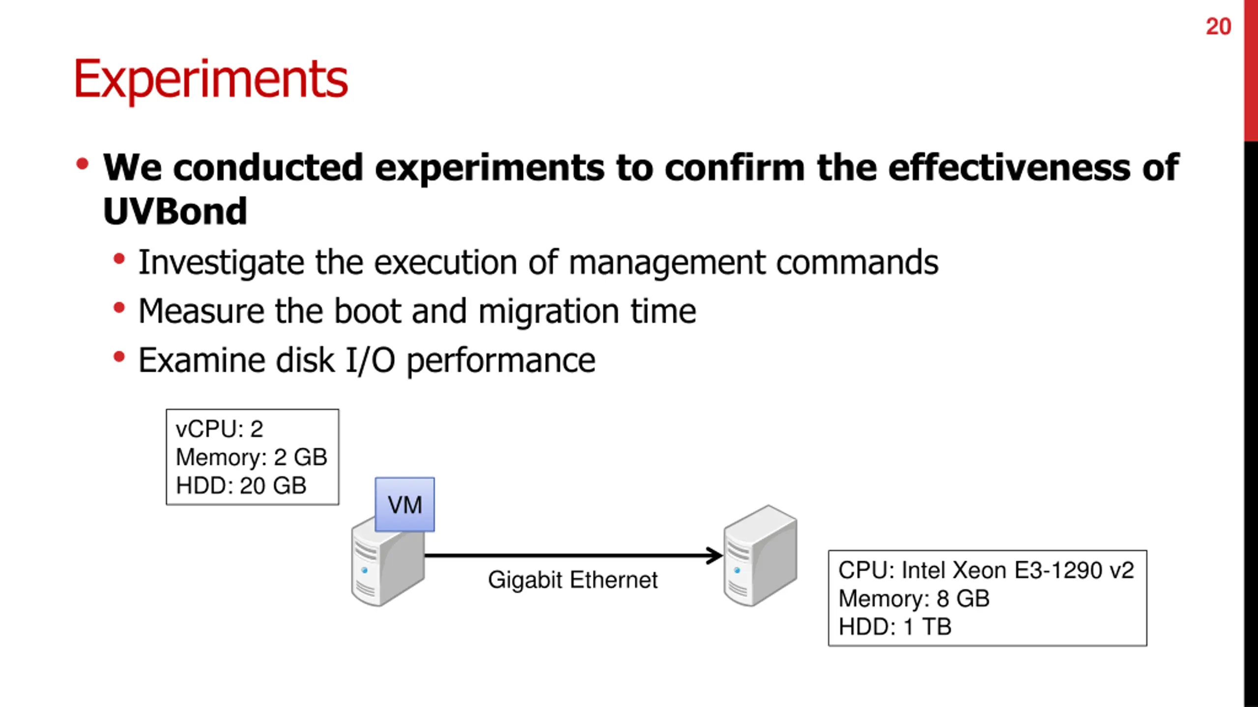 20 Experiments We conducted experiments to confirm the effectiveness of UVBond Investigate the execution of management commands Measure the boot and migration time Examine disk I/O performance vCPU: 2 Memory: 2 GB HDD: 20 GB VM CPU: Intel Xeon E3-1290 v2 Memory: 8 GB HDD: 1 TB Gigabit Ethernet