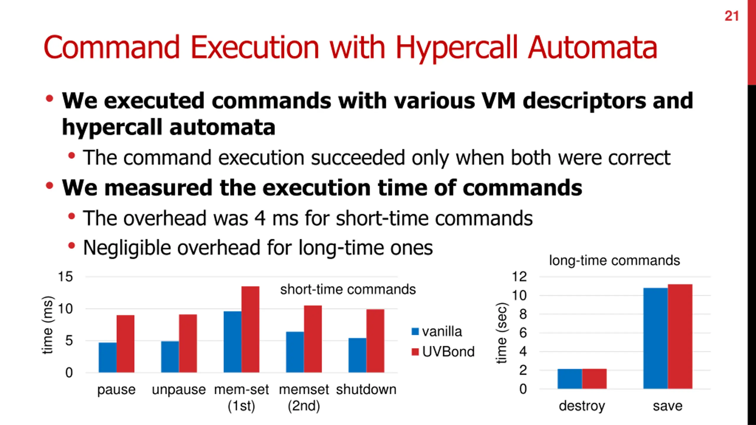 21 Command Execution with Hypercall Automata We executed commands with various VM descriptors and hypercall automata The command execution succeeded only when both were correct We measured the execution time of commands The overhead was 4 ms for short-time commands Negligible overhead for long-time ones long-time commands 15 12 short-time commands 10 time (ms) 10 time (sec) 8 vanilla UVBond 6 5 4 2 0 0 pause unpause mem-set memset (2nd) shutdown (1st) destroy save