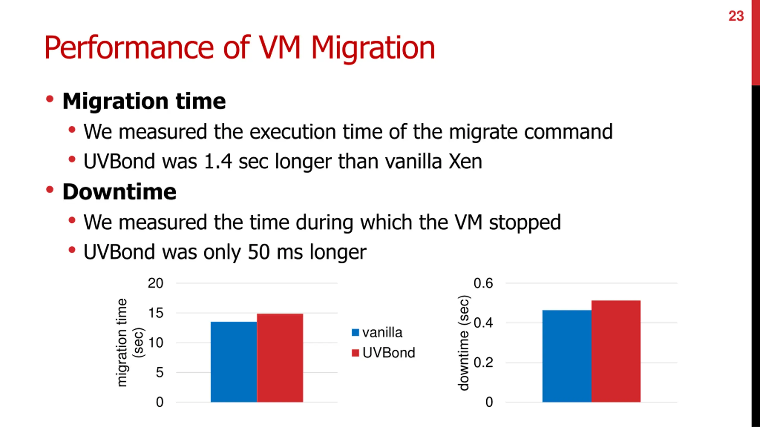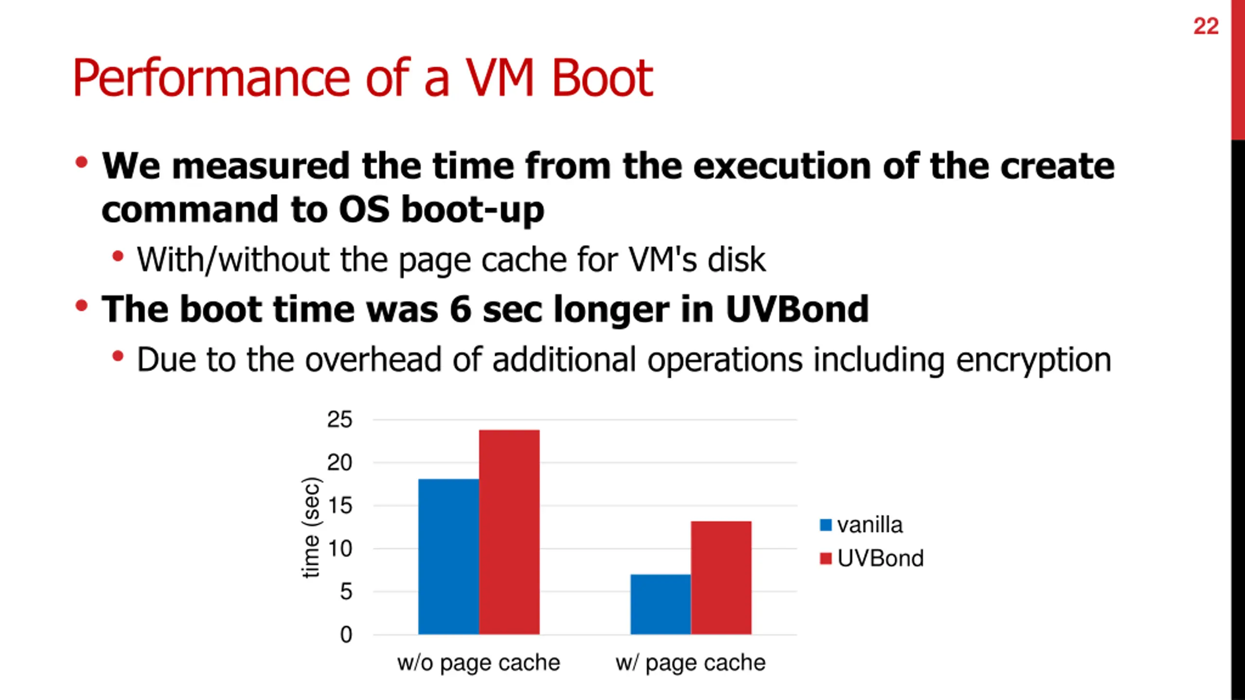 22 Performance of a VM Boot We measured the time from the execution of the create command to OS boot-up With/without the page cache for VM's disk The boot time was 6 sec longer in UVBond Due to the overhead of additional operations including encryption 25 20 time (sec) 15 vanilla UVBond 10 5 0 w/o page cache w/ page cache