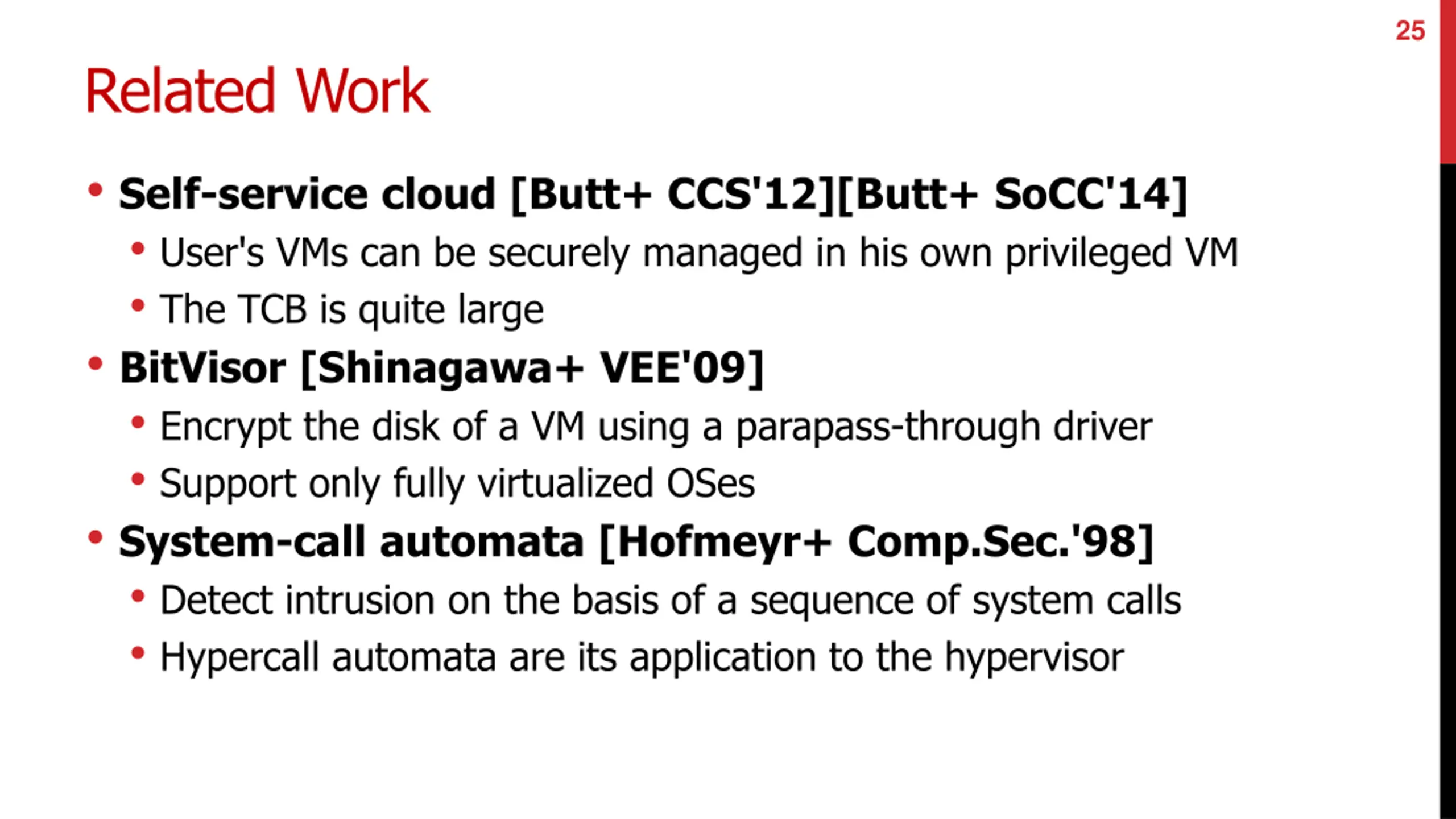 25 Related Work Self-service cloud [Butt+ CCS'12][Butt+ SoCC'14] User's VMs can be securely managed in his own privileged VM The TCB is quite large BitVisor [Shinagawa+ VEE'09] Encrypt the disk of a VM using a parapass-through driver Support only fully virtualized OSes System-call automata [Hofmeyr+ Comp.Sec.'98] Detect intrusion on the basis of a sequence of system calls Hypercall automata are its application to the hypervisor