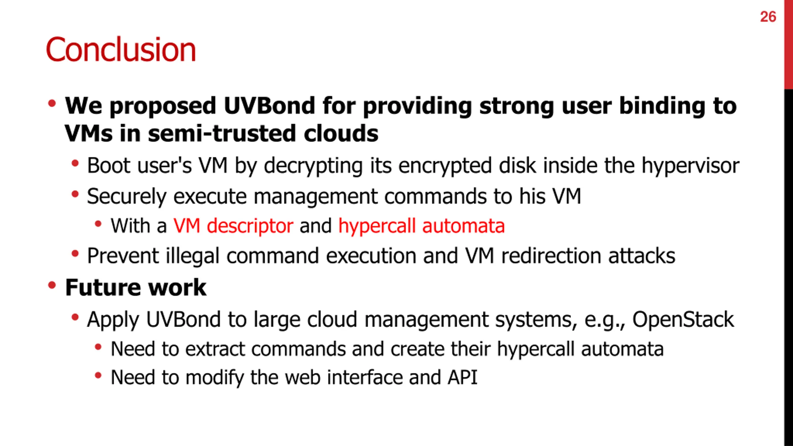 26 Conclusion We proposed UVBond for providing strong user binding to VMs in semi-trusted clouds Boot user's VM by decrypting its encrypted disk inside the hypervisor Securely execute management commands to his VM With a VM descriptor and hypercall automata Prevent illegal command execution and VM redirection attacks Future work Apply UVBond to large cloud management systems, e.g., OpenStack Need to extract commands and create their hypercall automata Need to modify the web interface and API