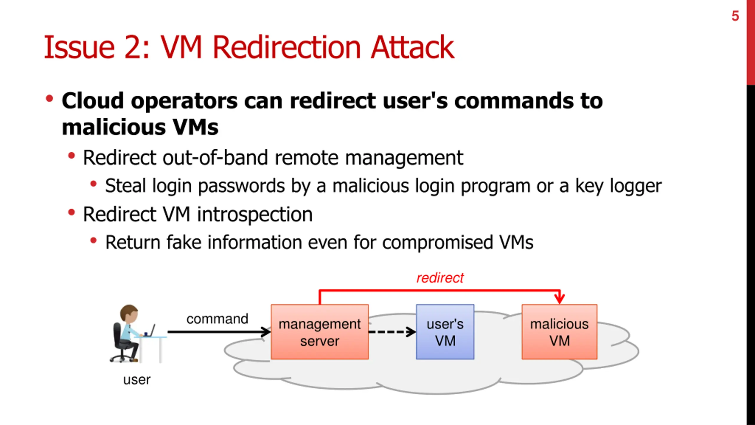 4 Issue 1: Illegal Command Execution Cloud operators can execute arbitrary management commands to VMs Perform out-of-band remote management Access virtual serial consoles and GUI consoles of VMs Perform VM introspection Access the memory, disks, and network of VMs Eavesdrop on and tamper with sensitive information VM illegal command operators